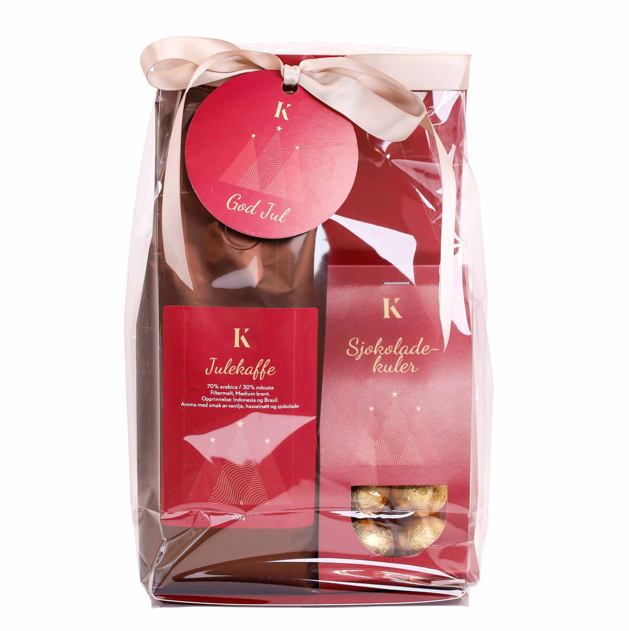 Dette gavepakket settet inneholder en pose julekaffe og en eske med sjokoladekuler, en perfekt kombinasjon for å sette stemningen gjennom hele julehøytiden. Kaffen er laget av en blanding av arabica og robusta med en smak som passer godt til koselige stunder. Sjokoladekulene gir en søt avslutning og kan nytes alene eller ved siden av en varm kopp kaffe. Alt er vakkert pakket inn med en "God Jul"-tag, som gjør dette settet ideelt som en gave til noen du ønsker å glede i juletiden.