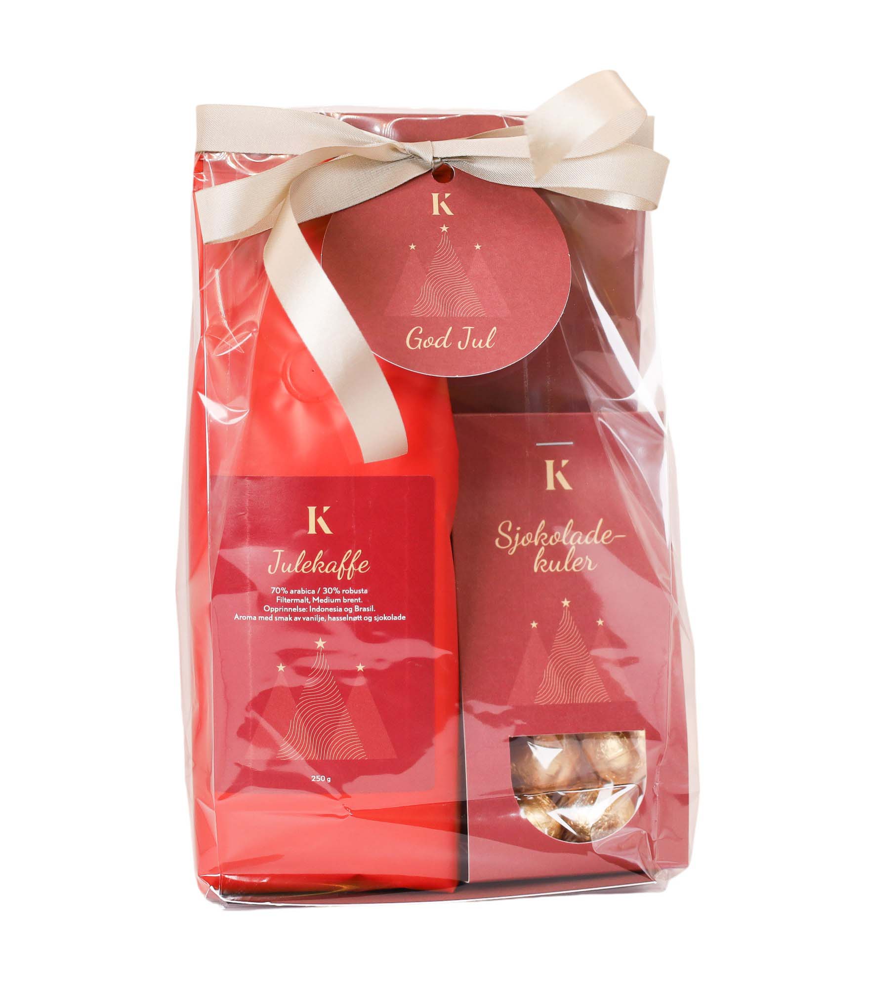 Dette gavepakket settet inneholder en pose julekaffe og en eske med sjokoladekuler, en perfekt kombinasjon for å sette stemningen gjennom hele julehøytiden. Kaffen er laget av en blanding av arabica og robusta med en smak som passer godt til koselige stunder. Sjokoladekulene gir en søt avslutning og kan nytes alene eller ved siden av en varm kopp kaffe. Alt er vakkert pakket inn med en "God Jul"-tag, som gjør dette settet ideelt som en gave til noen du ønsker å glede i juletiden.