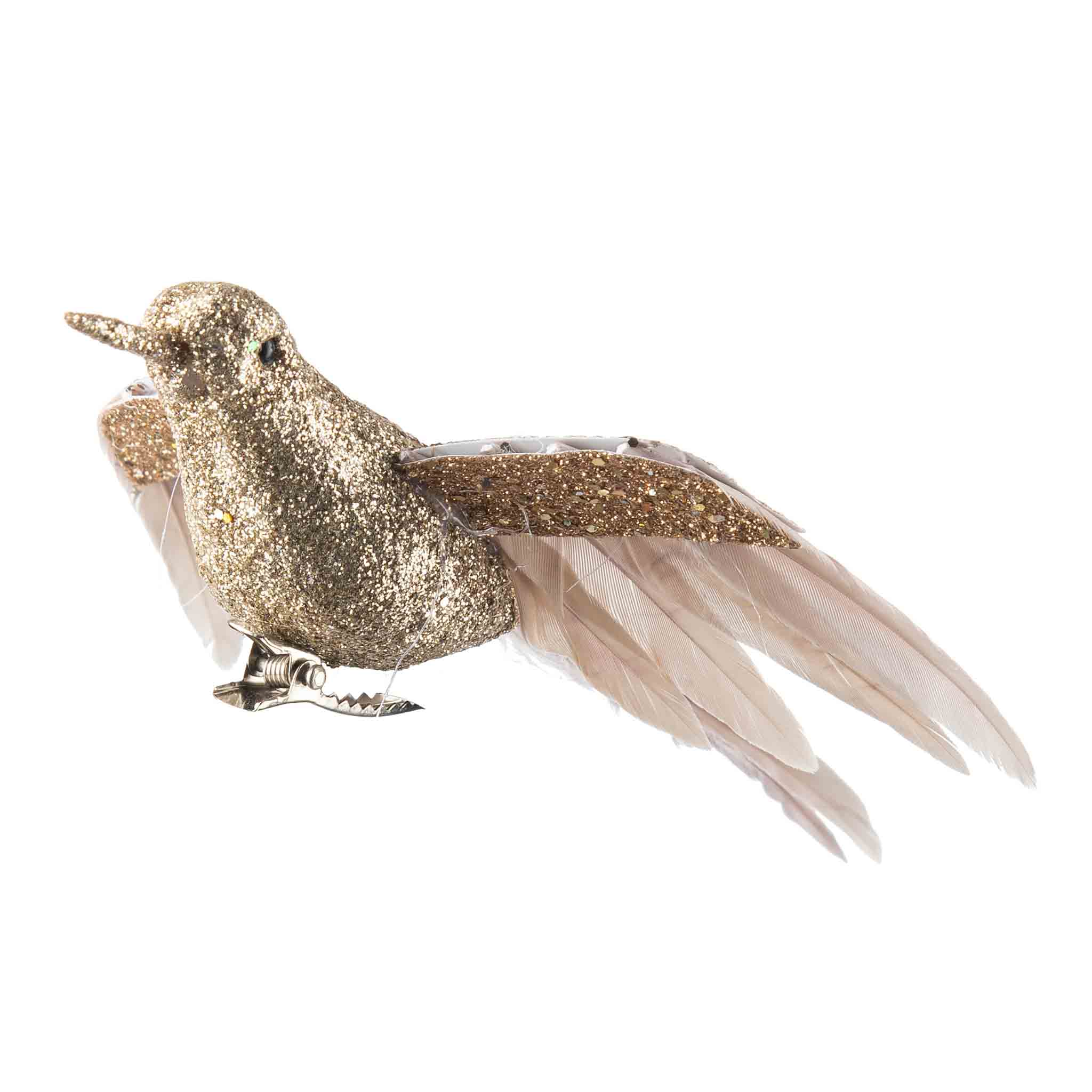 Denne fine kolibri på klype til jul, kan enkelt festes på juletre, krans, adventsstake eller hvor som helst du ønsker å legge til litt julemagi. Den kommer i to fargevarianter, gull og brun. Kolibriene har myke fjær og glitter, som skaper en unik look.