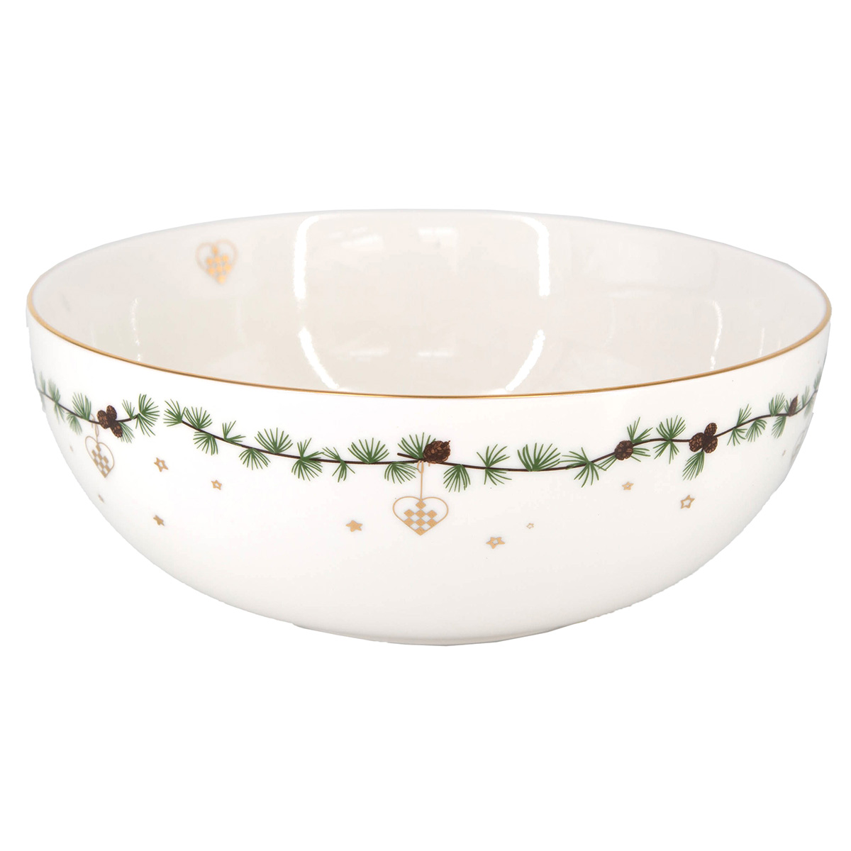 Stor salatbolle dekorert med granbar, kongler og små julehjerter i gull. Perfekt til julemiddag eller servering av poteter, frukt og snacks i førjulstiden. En vakker detalj på bordet, alene eller sammen med resten av serien.