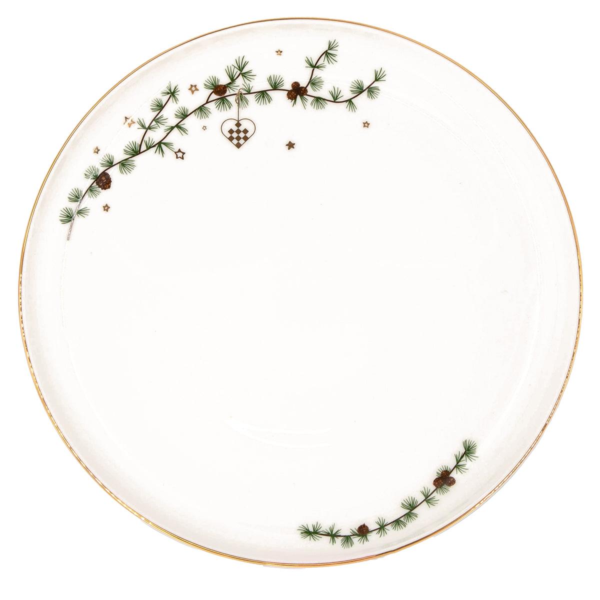 Elegant middagstallerken med klassisk julemotiv i grønt, gull og brunt. De fine detaljene med kongler, stjerner og julehjerte gir en varm og tradisjonell stemning til julemåltidet. Match gjerne med resten av serviset for en helhetlig borddekking.