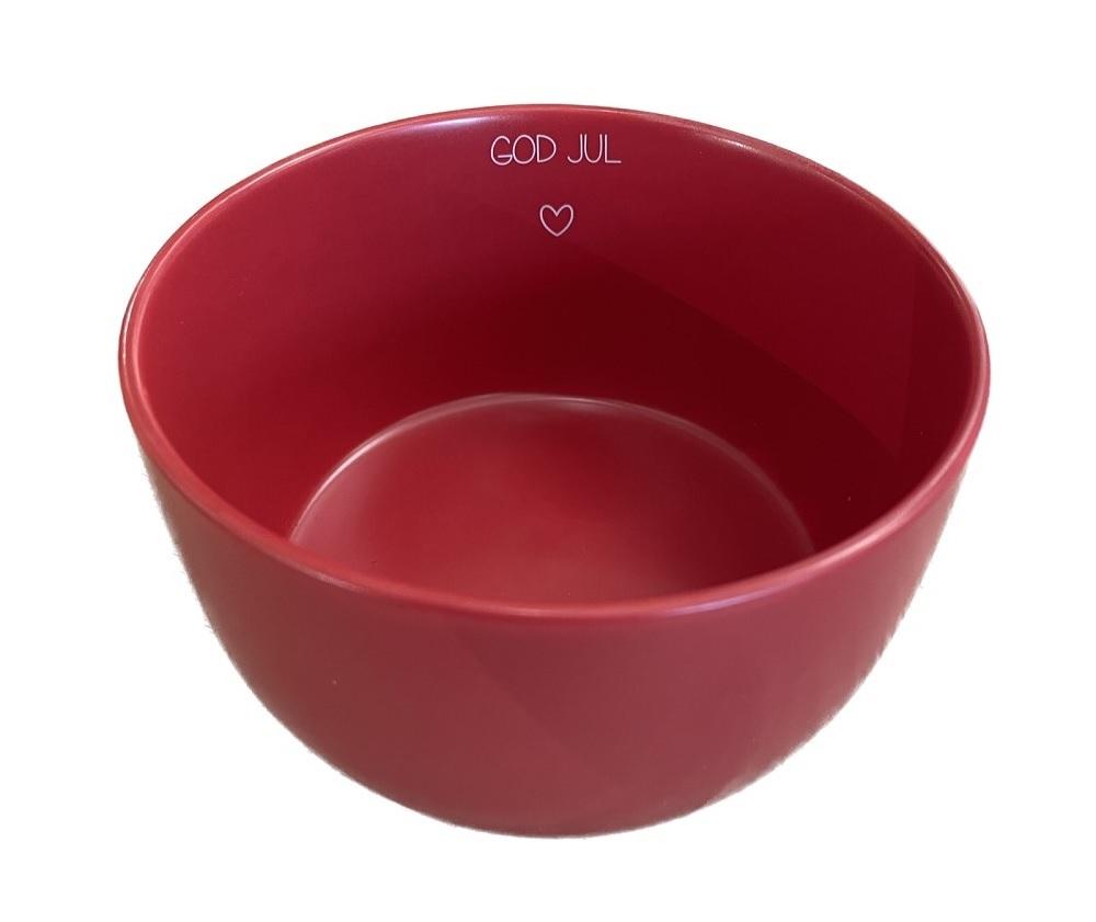 Rød og fin skål med tekst God jul og et lite hjerte inne i skålen. Perfekt til julens søtsaker, nøtter, grøt eller riskremen på julaften.