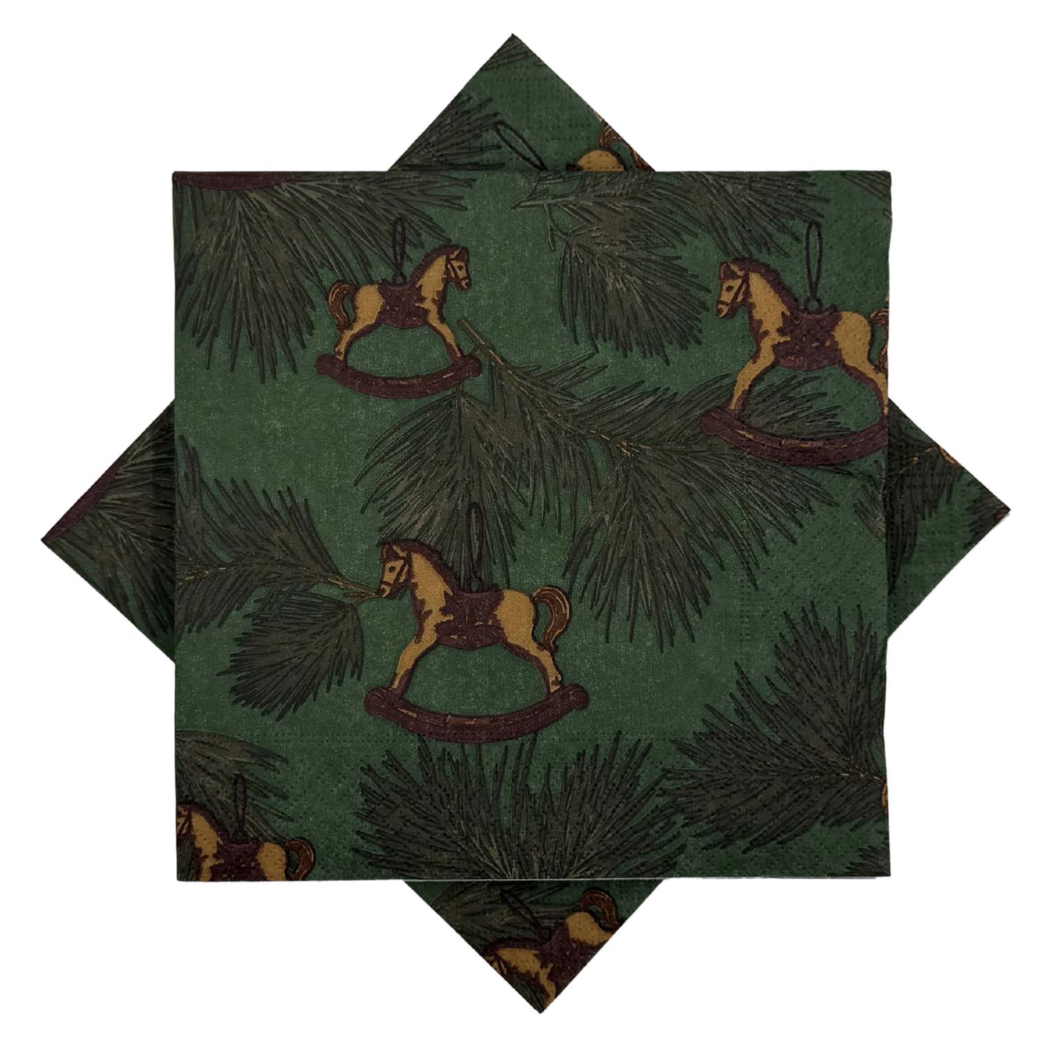 Papirserviett med nostalgisk gyngehest og grønne barnåler på mørkegrønn bakgrunn. En klassisk julefavoritt som setter stemningen ved bordet.