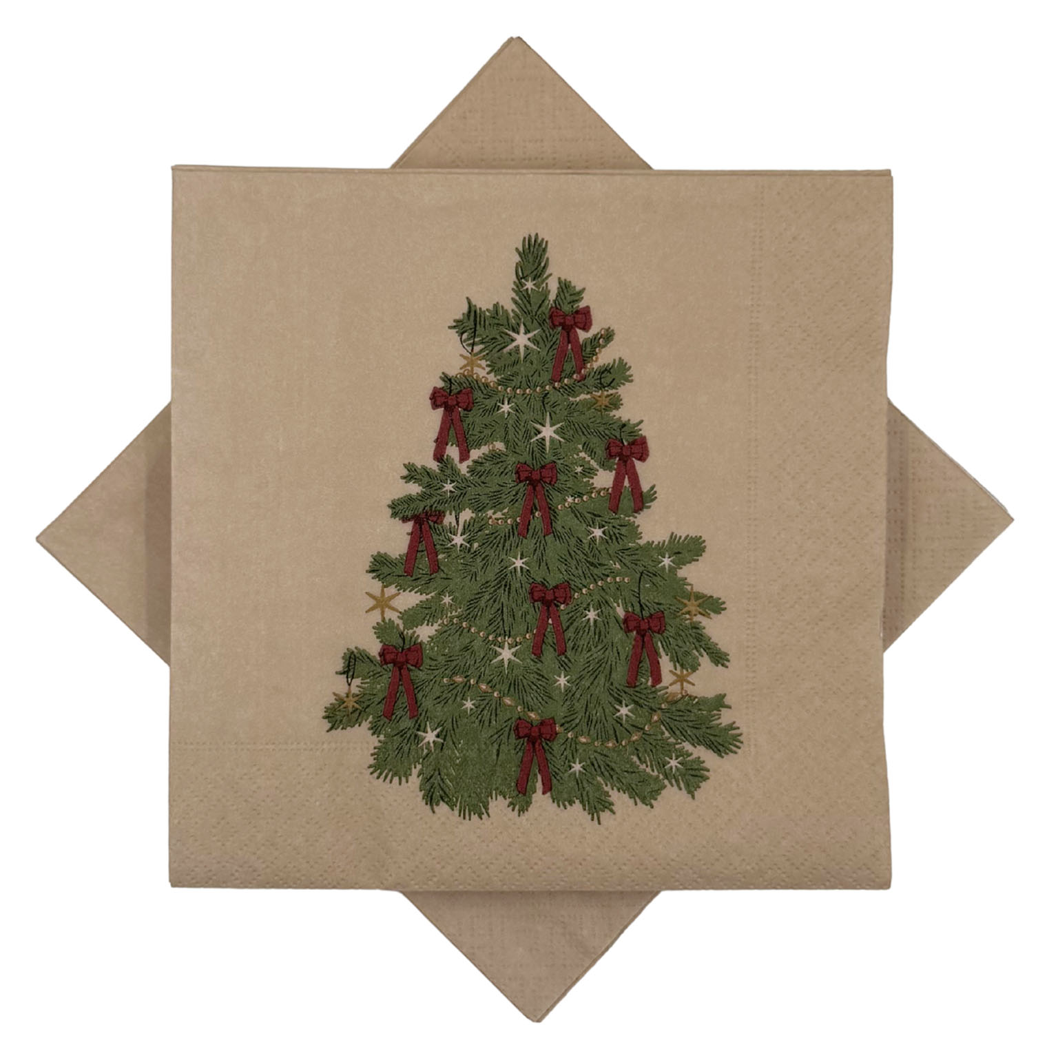 Papirserviett med klassisk juletremotiv på beige bakgrunn, pyntet med røde sløyfer og stjerner. Et stemningsfullt innslag på julebordet.