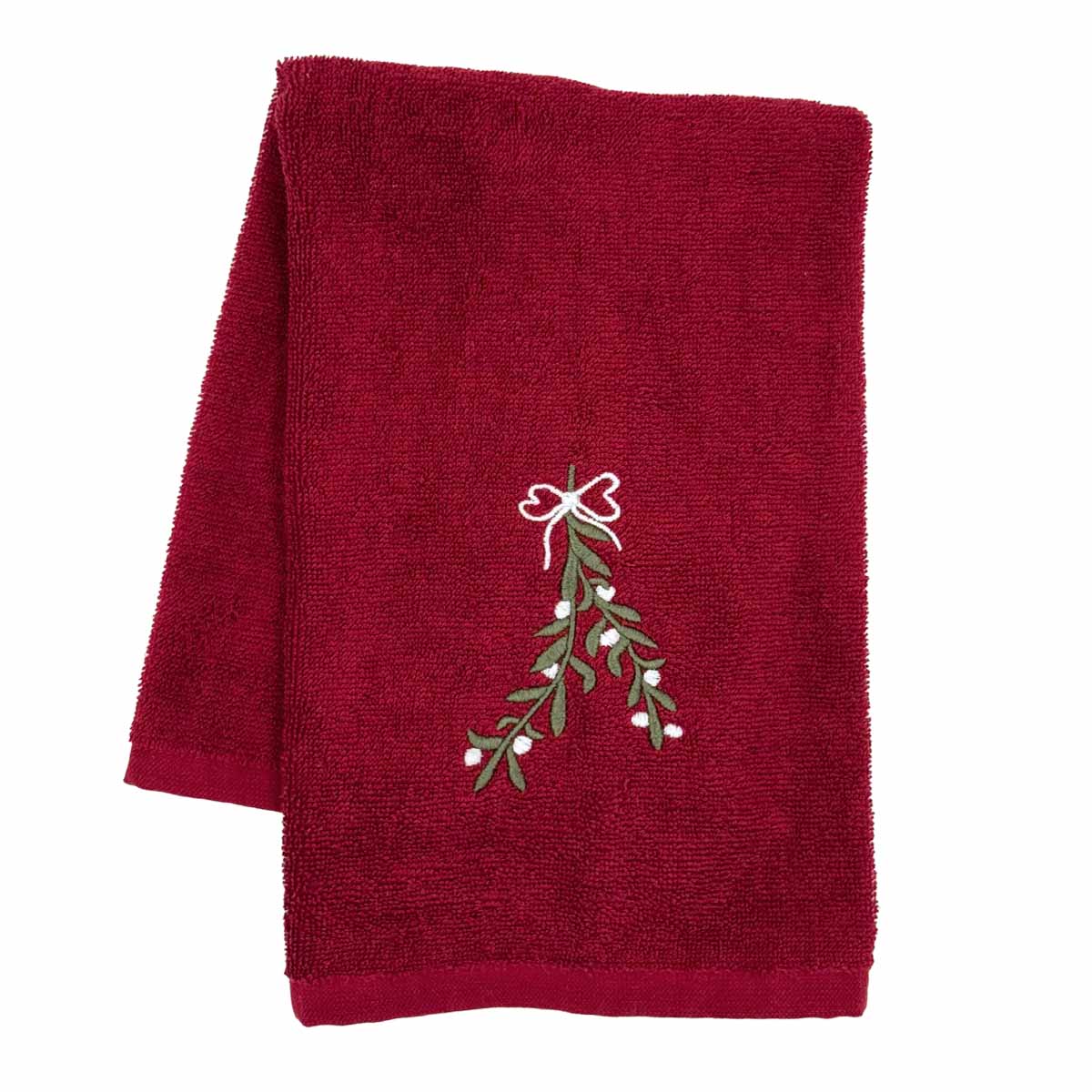 Et mykt og dekorativt gjestehåndkle i dyp rød farge, med brodert misteltein som gir en lun og tradisjonell julestemning på badet. Perfekt som en liten detalj i høytiden.