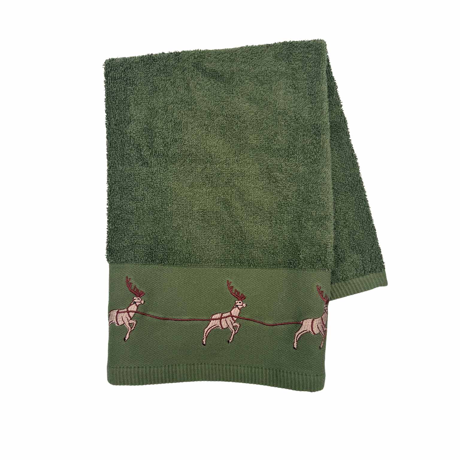 Dette grønne håndkleet er pyntet med en sjarmerende rad av reinsdyr brodert langs kanten. Perfekt for å tilføre litt juleglede på badet eller kjøkkenet. Laget av mykt materiale som gjør det behagelig å bruke til både hender og ansikt. En fin måte å feire høytiden på med praktiske detaljer som kan brukes hver dag. Lett å vaske og holde rent, slik at det kan tas frem år etter år. Passer også godt som en liten gave til noen som liker å pynte til jul.