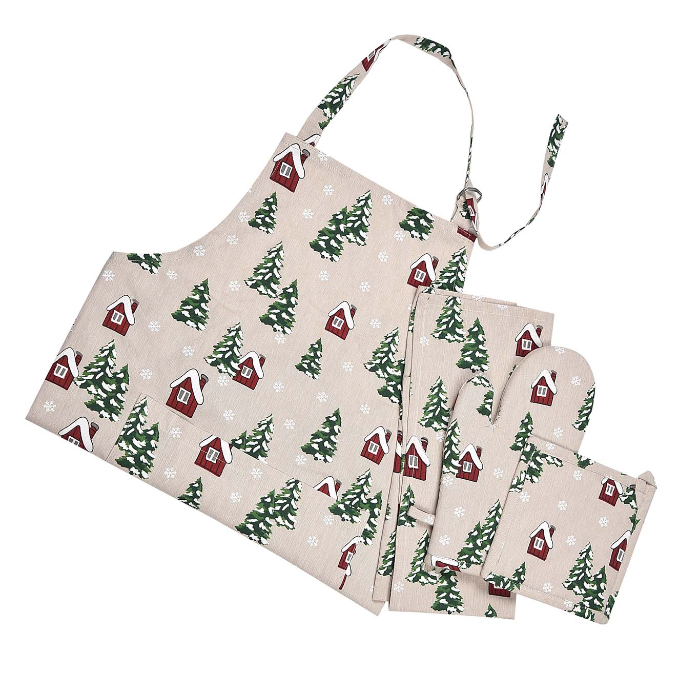 Grytesett bestående av håndduk, forklede, 1 grytelap og 1 vott med koselig julemotiv