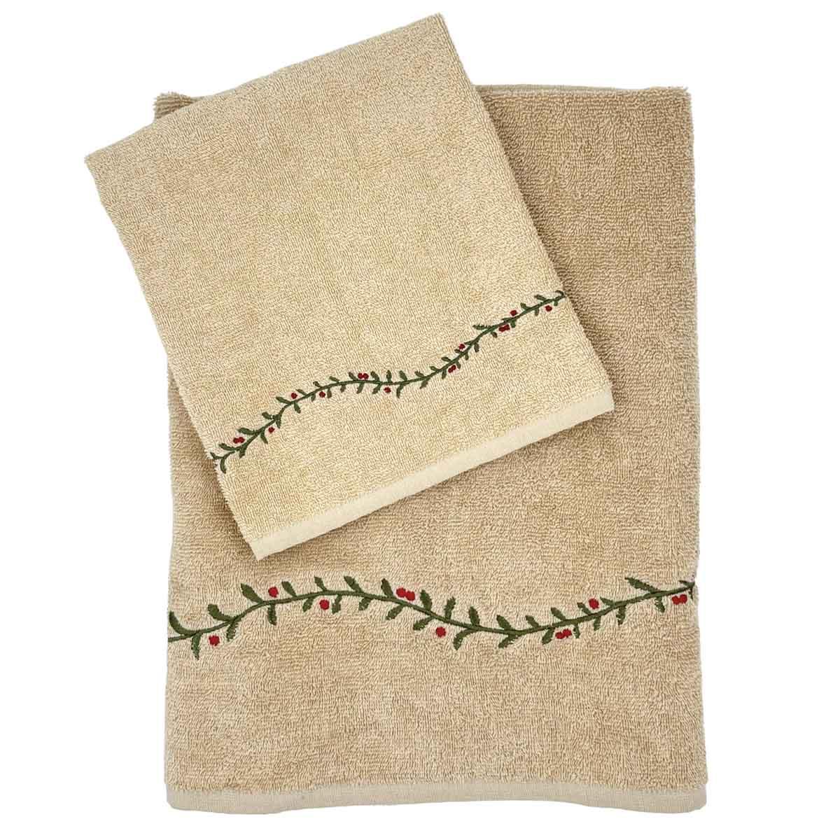 Mykt håndklesett med julebroderi av en grønn girlander med røde bær. Settet består av ett gjestehåndkle og ett badehåndkle i lun beige farge. Et stemningsfullt innslag til badet i høytiden – både praktisk og dekorativt.