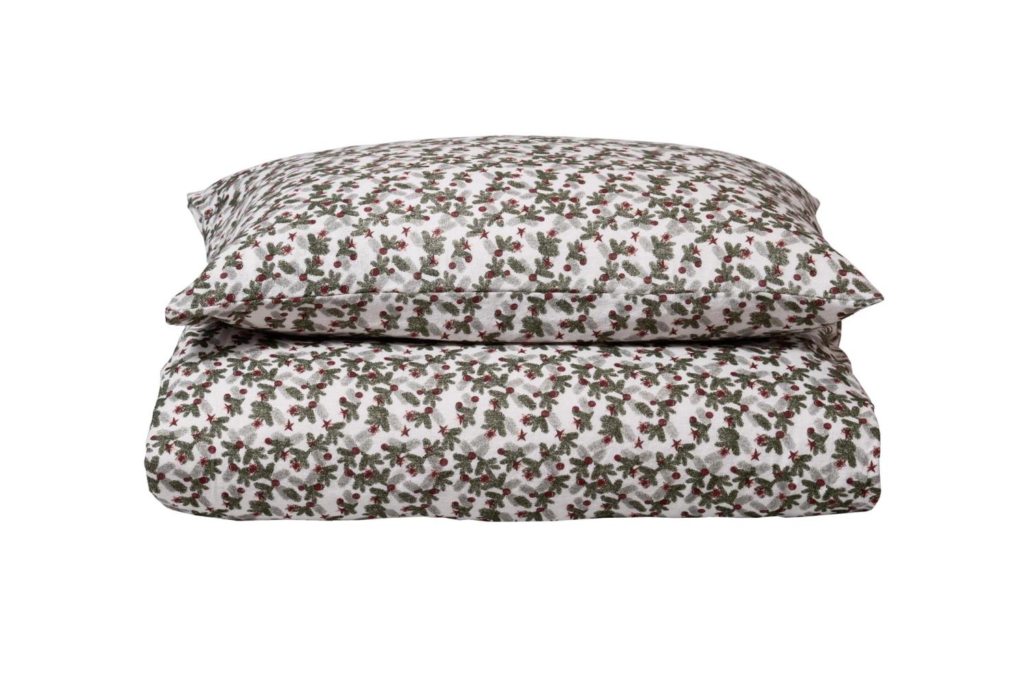 Dette sengesettet har et detaljert mønster med grener og bær som gir en varm og hyggelig stemning til soverommet. Settet inkluderer et putetrekk og et dynetrekk, laget i et mykt stoff som sikrer komfort og avslapning gjennom natten.