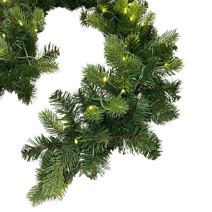 Dette er en grønn girlander med innebygde lys, som kan bidra til en lun stemning i hjemmet eller ved inngangspartiet. Girlanderen er enkel å forme og plassere, og lysene gjør at den skinner pent på mørke vinterkvelder. Heng den over peisen, langs en trapp eller rundt døren for en dekorativ effekt.