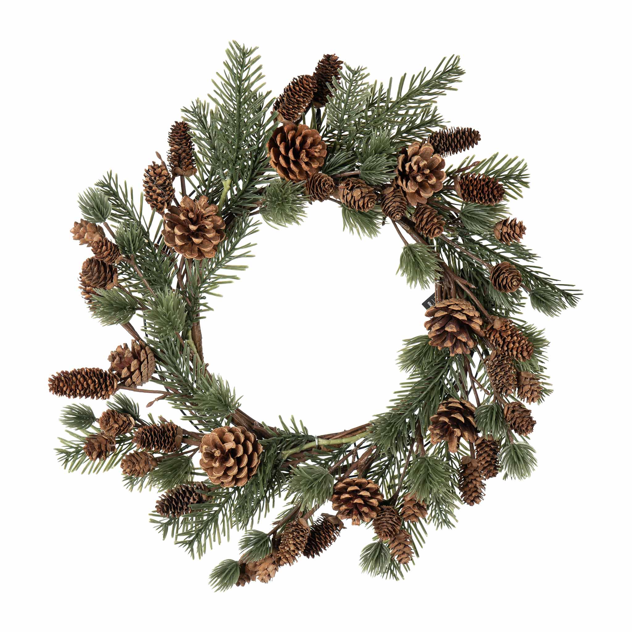 Naturtro julekrans med grønne grankvister og dekorative kongler. Fin å henge på døren, over peisen eller som midtpunkt på julebordet.