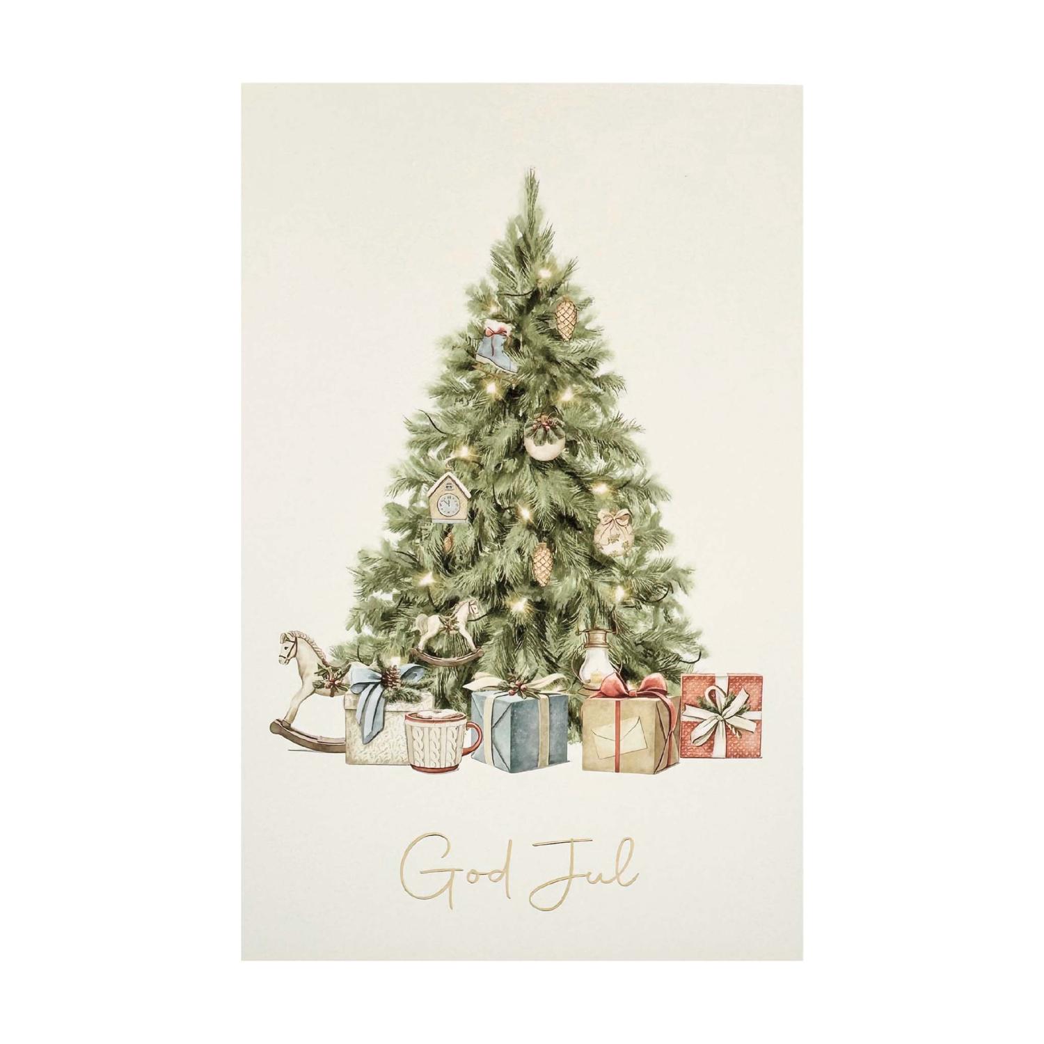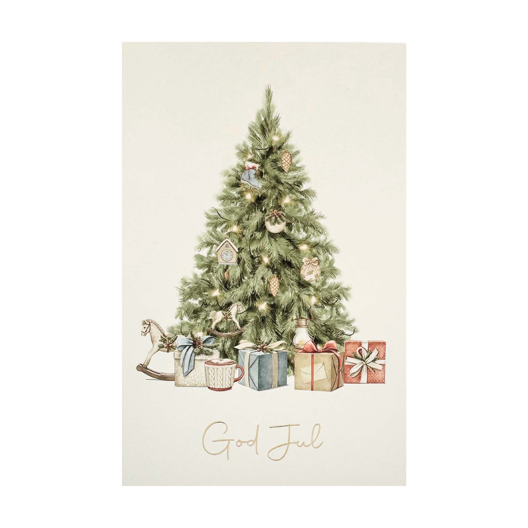 Dette julekortet har en klassisk illustrasjon av et pyntet juletre omringet av gaver og dekorasjoner. Den håndtegnede stilen gir kortet et nostalgisk preg som minner om julens tradisjoner. Med teksten "God Jul" i elegant skrift, er dette kortet en hyggelig måte å sende en varm julehilsen til venner og familie.