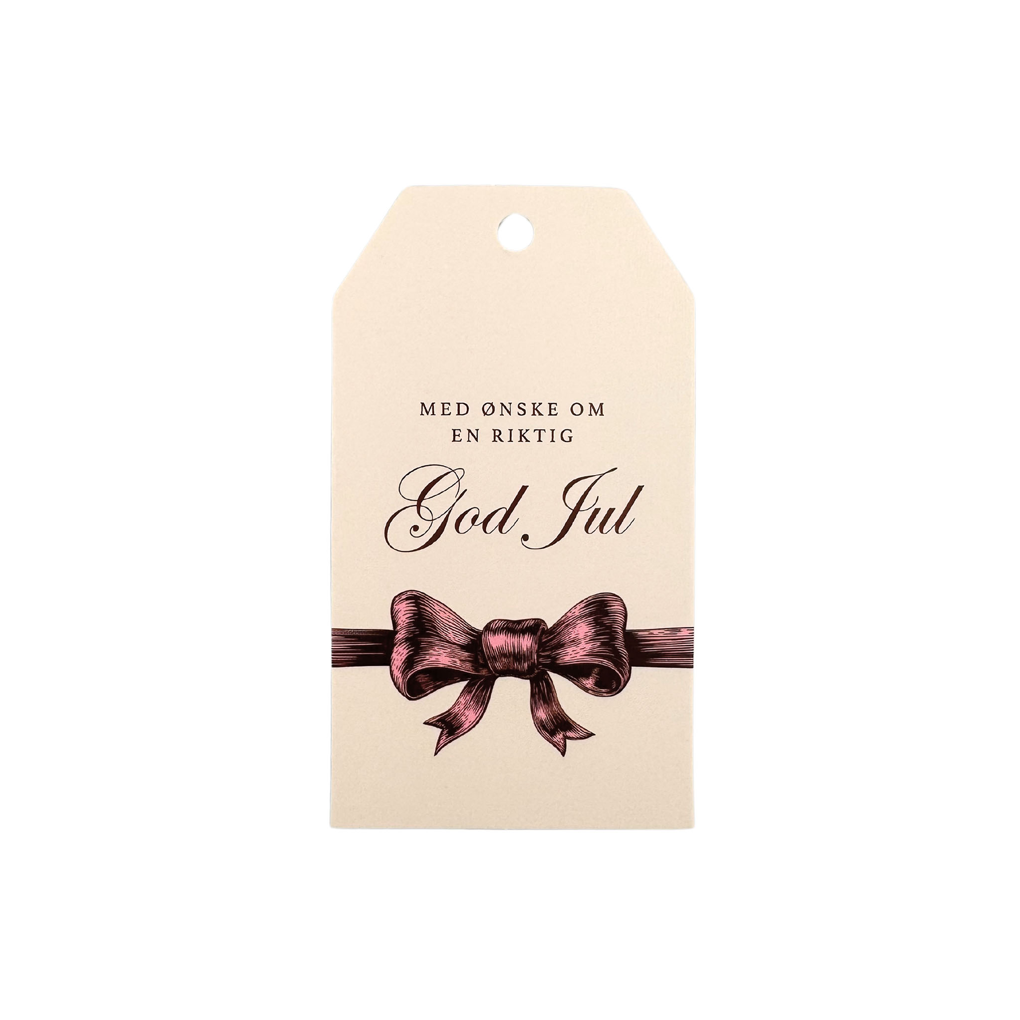Denne gave-taggen med teksten "Med ønske om en riktig God Jul" gir en elegant og tradisjonell hilsen til gavene dine. Med et nostalgisk motiv av en sløyfe, er den et perfekt tillegg til juleinnpakningen. Fest denne taggen på pakken for en personlig og varm julehilsen som garantert setter en ekstra spiss på gaven.
