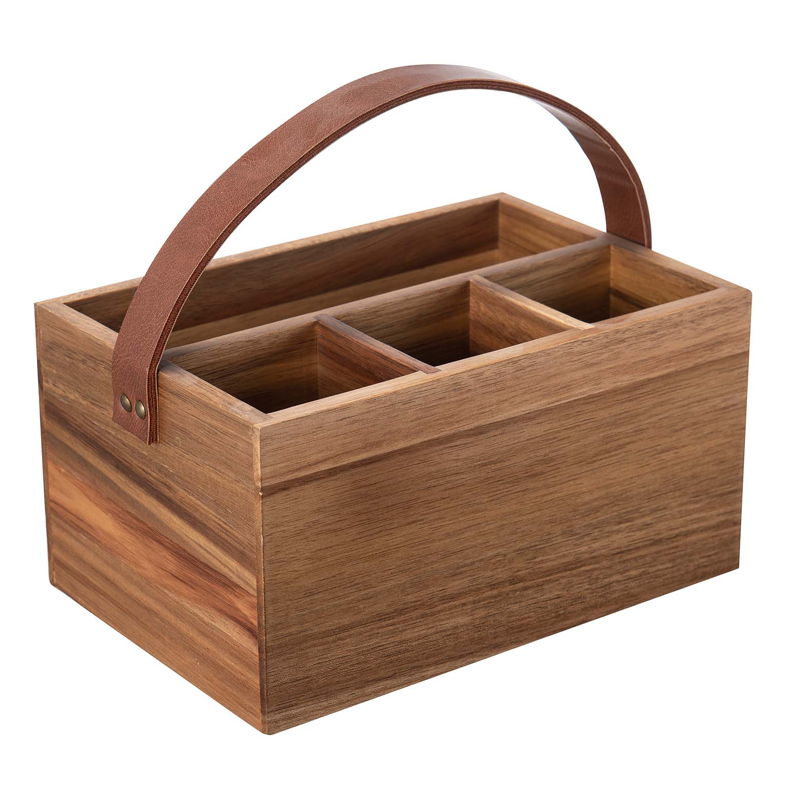 Tøff bestikkholder i akasietre med håndtak i skinn. Avdelt i 6 rom for plass til å dele etter ønske og behov. Supertøff å ha fremme på kjøkkenbenken.