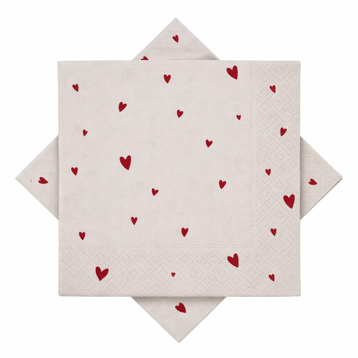 Servietter med røde hjerter som gir bordet et varmt uttrykk og skaper koselig stemning.