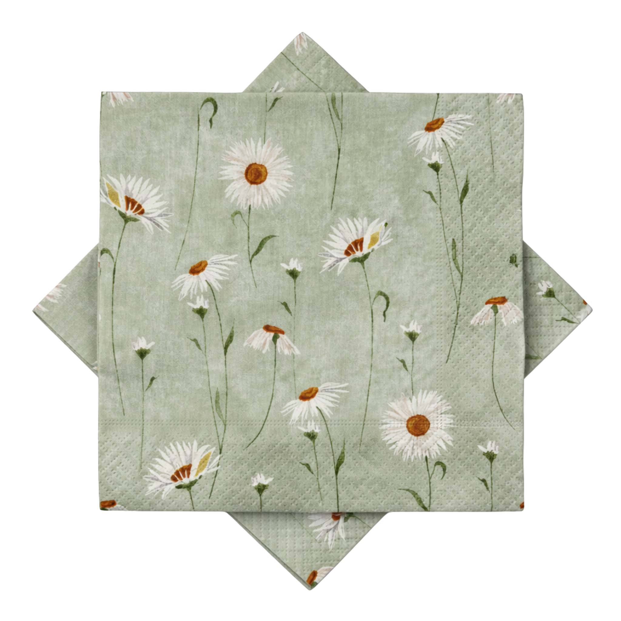 Papirserviett med margerittblomster på grønn bakgrunn. Perfekt til sommerbordet. Suppler med fint servise og dekkebrikker for en helhetlig borddekking.