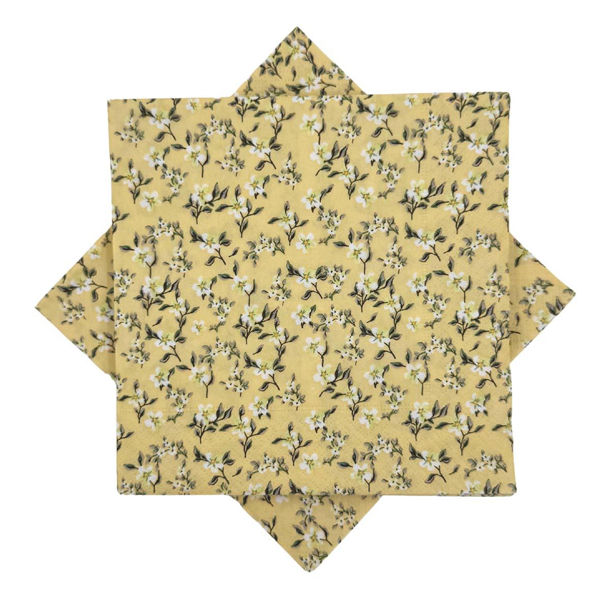 Servietter med små blomster på gul bakgrunn som gir borddekkingen et lyst og hyggelig preg sammen med serviser.