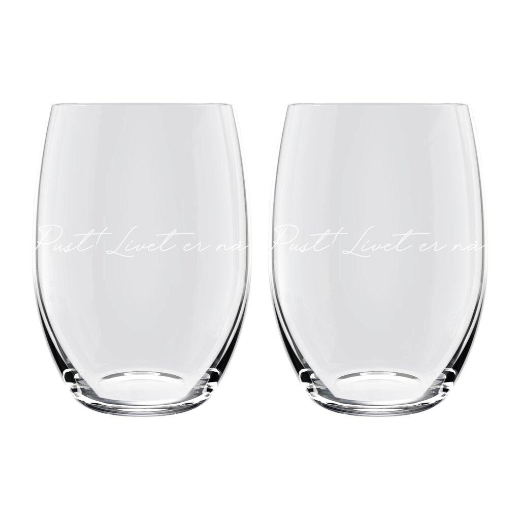 To stilrene vannglass fra Lykketegning med teksten «Pust. Livet er nå» inngravert i elegant håndskrift. Glassene har en avrundet form som ligger godt i hånden, og passer like fint til vann som til juice, smoothie eller iste. En fin påminnelse i hverdagen om å senke skuldrene og være til stede i øyeblikket, enten til deg selv eller en god venn.