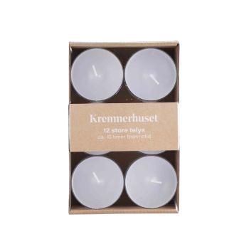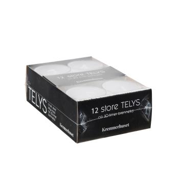 Store telys i pakning på 12 stk. Det fine med store telys er at de kan brukes i større lykter. Flammen vil da ligge lavt i lykten og lyse oppover i lykten.