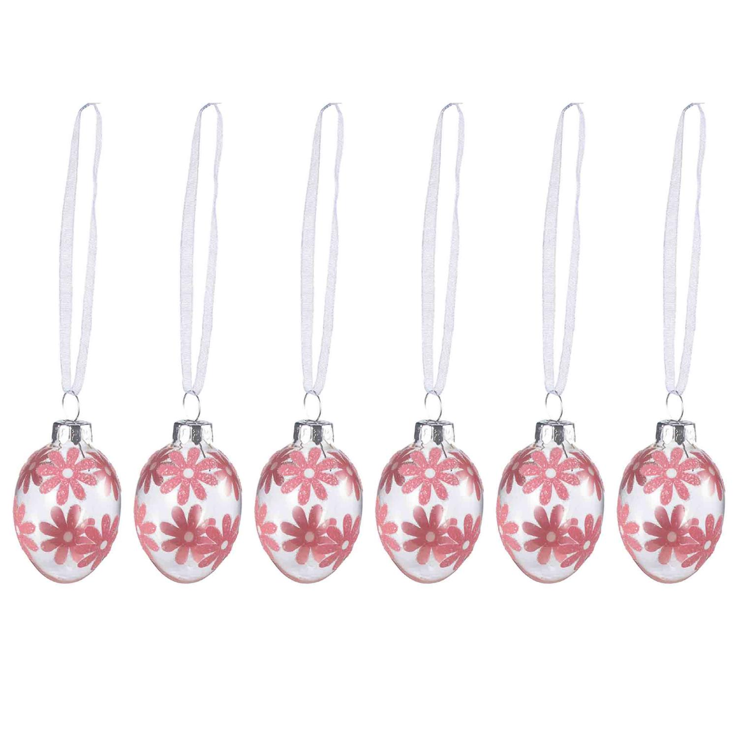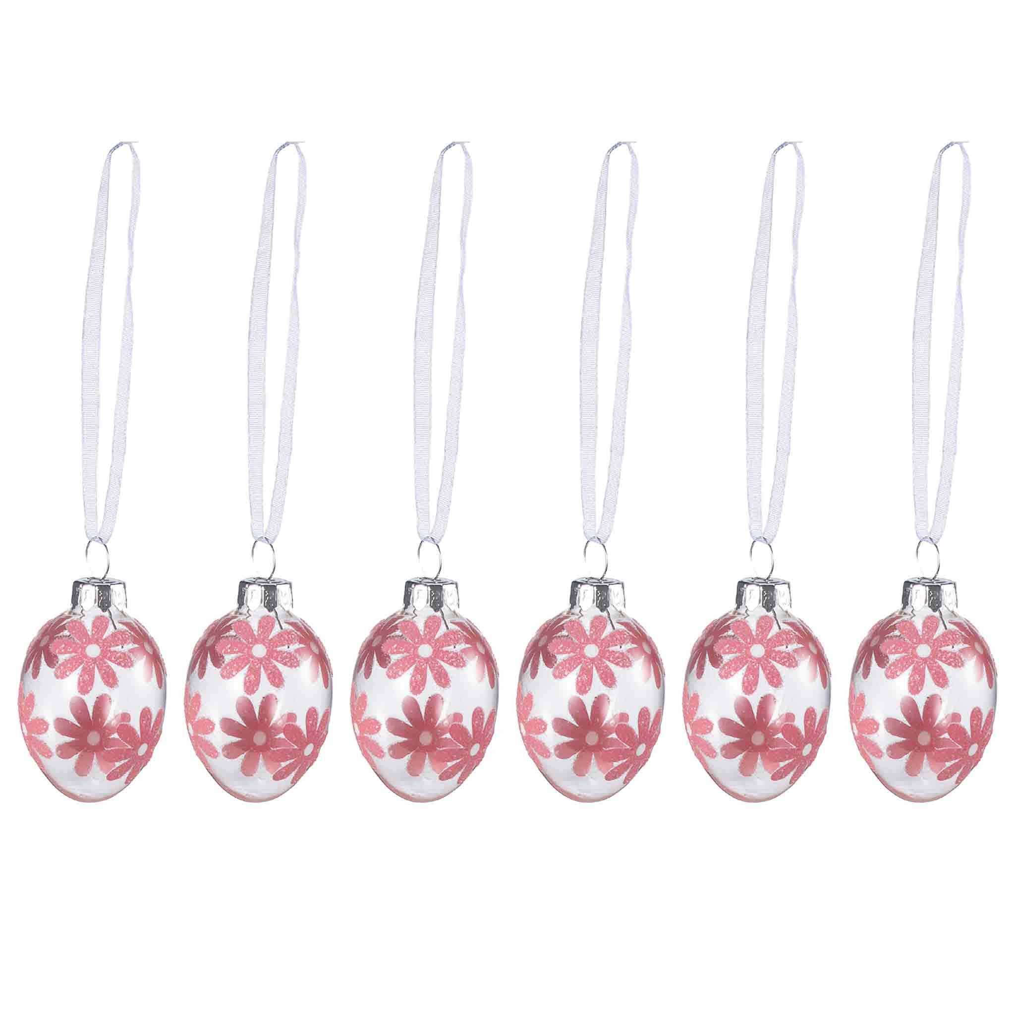 De seks glasseggene er dekorert med vakre, rosa blomster som lyser opp påskepynten. Med sine fine detaljer og klare glass, gir de et lett og lyst inntrykk når de henges på gåsunger eller settes sammen med andre dekorasjoner på bordet.