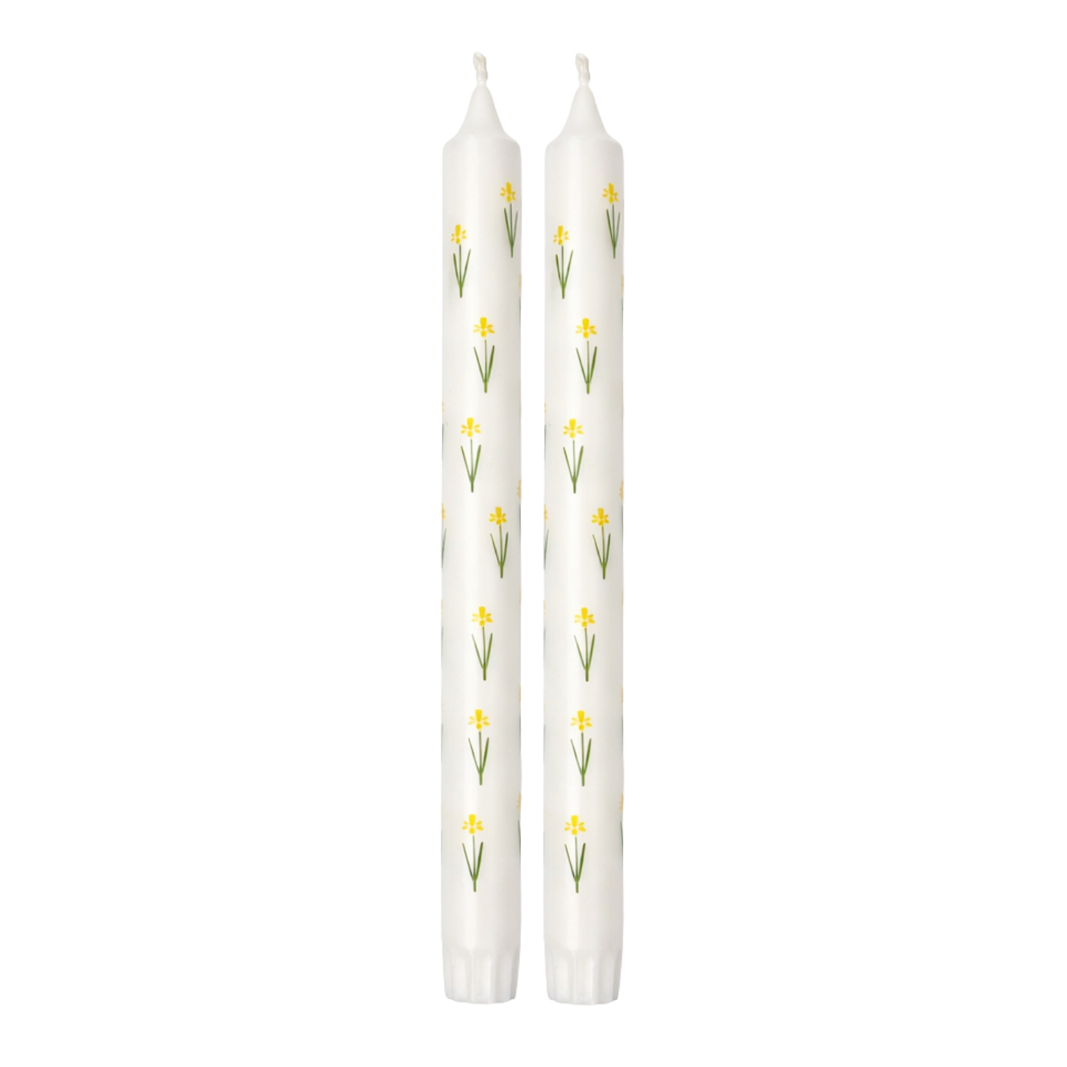 En fin 2-pk kronelys med liljeblomst motiv. Perfekt for å pynte lysestakene opp litt ekstra på våren og i påsken.