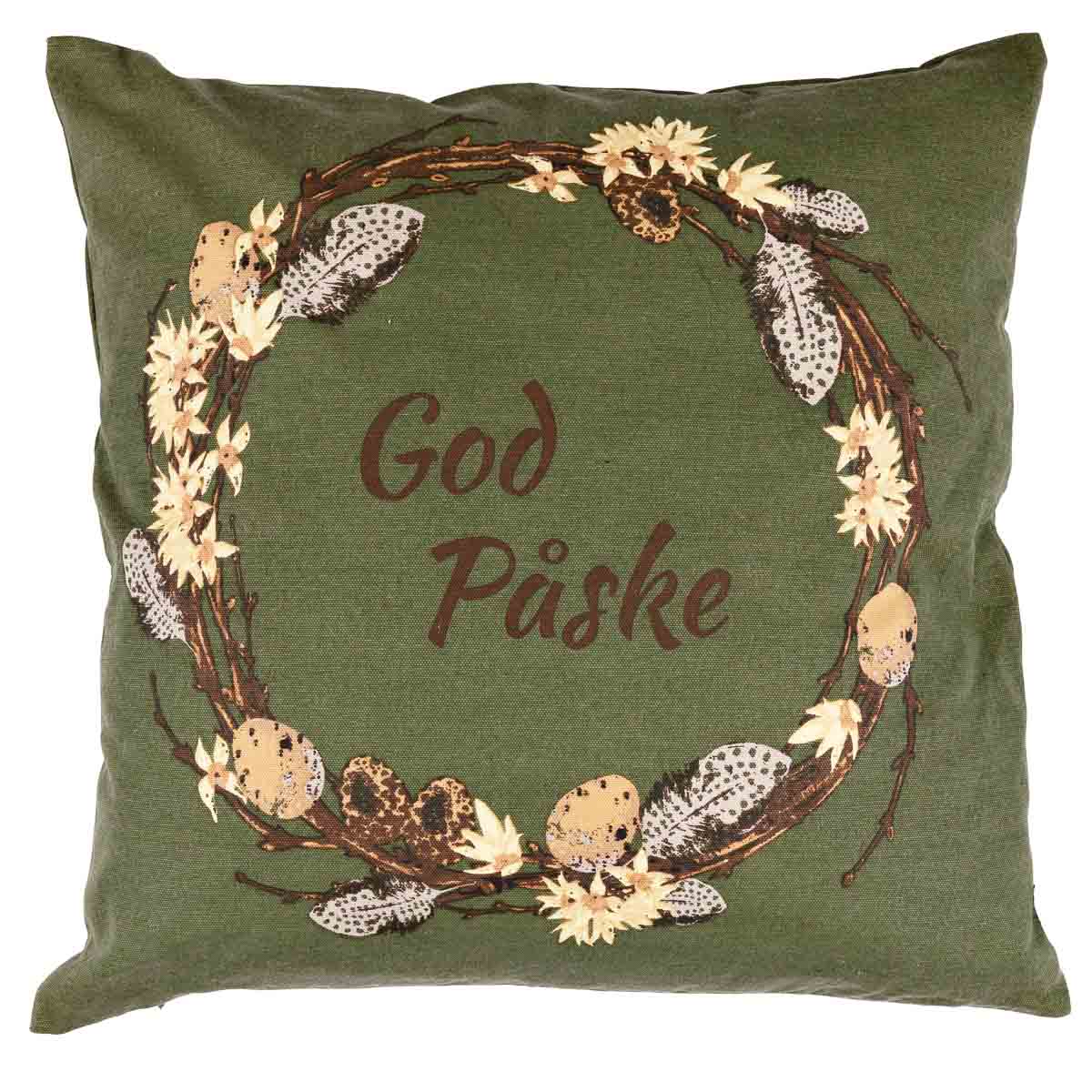 Med denne puten blir det påske i stuen. Med fin vårlig krans og "God påske"-print er påskestemningen sikret. kombiner gjerne med puter i andre tekstiler som velur, boucle eller tuftet bomull for et spennende uttrykk.