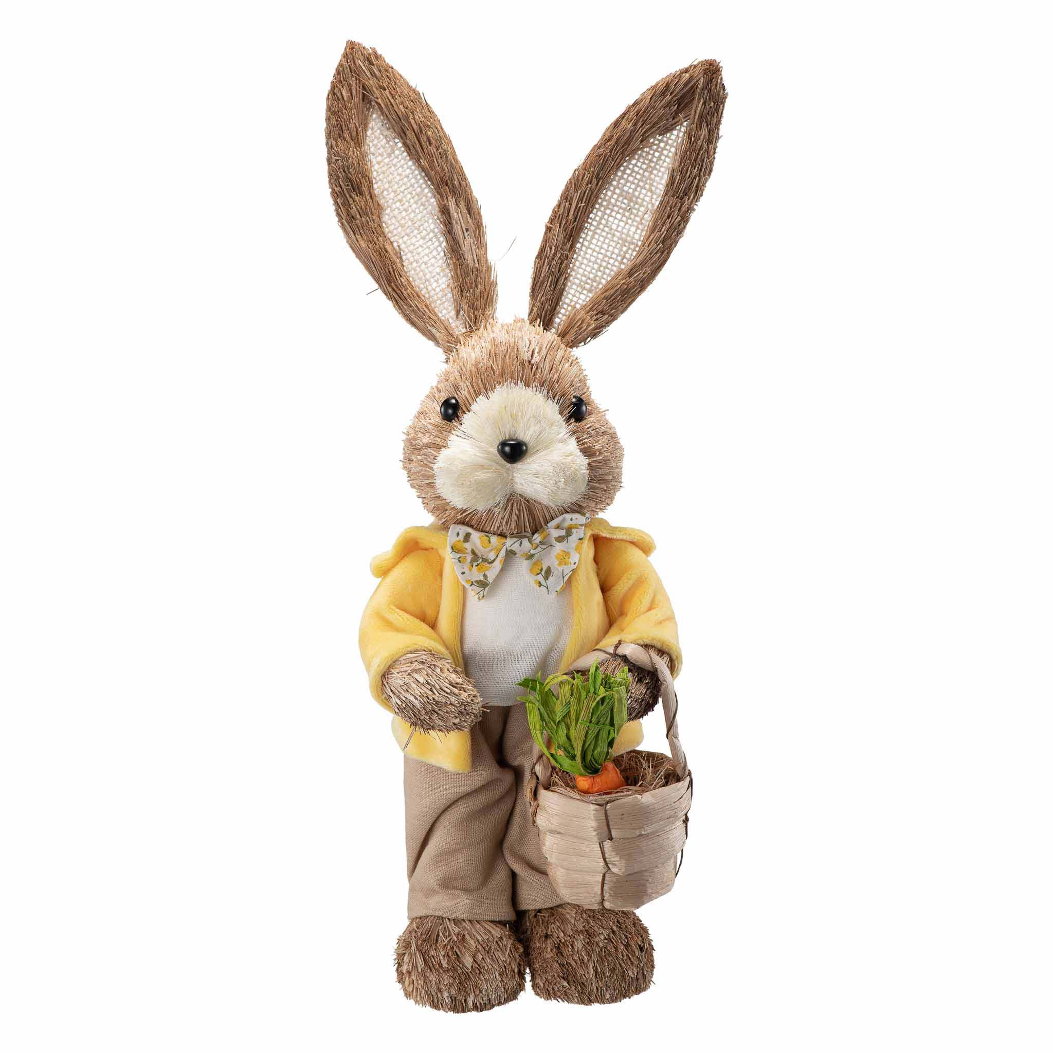 En dekorativ påskekanin i naturmaterialer, kledd i gule og beige toner og med en liten kurv med gulrot i hånden. Denne kaninen er fin som et blikkfang på gulvet, på en skjenk eller ved inngangspartiet, og skaper en hyggelig velkomst i påsketiden. En stemningsfull figur som gir hjemmet et rolig og gjennomført preg gjennom hele våren. Sett den sammen med hare jente og lag en liten harefamilie.