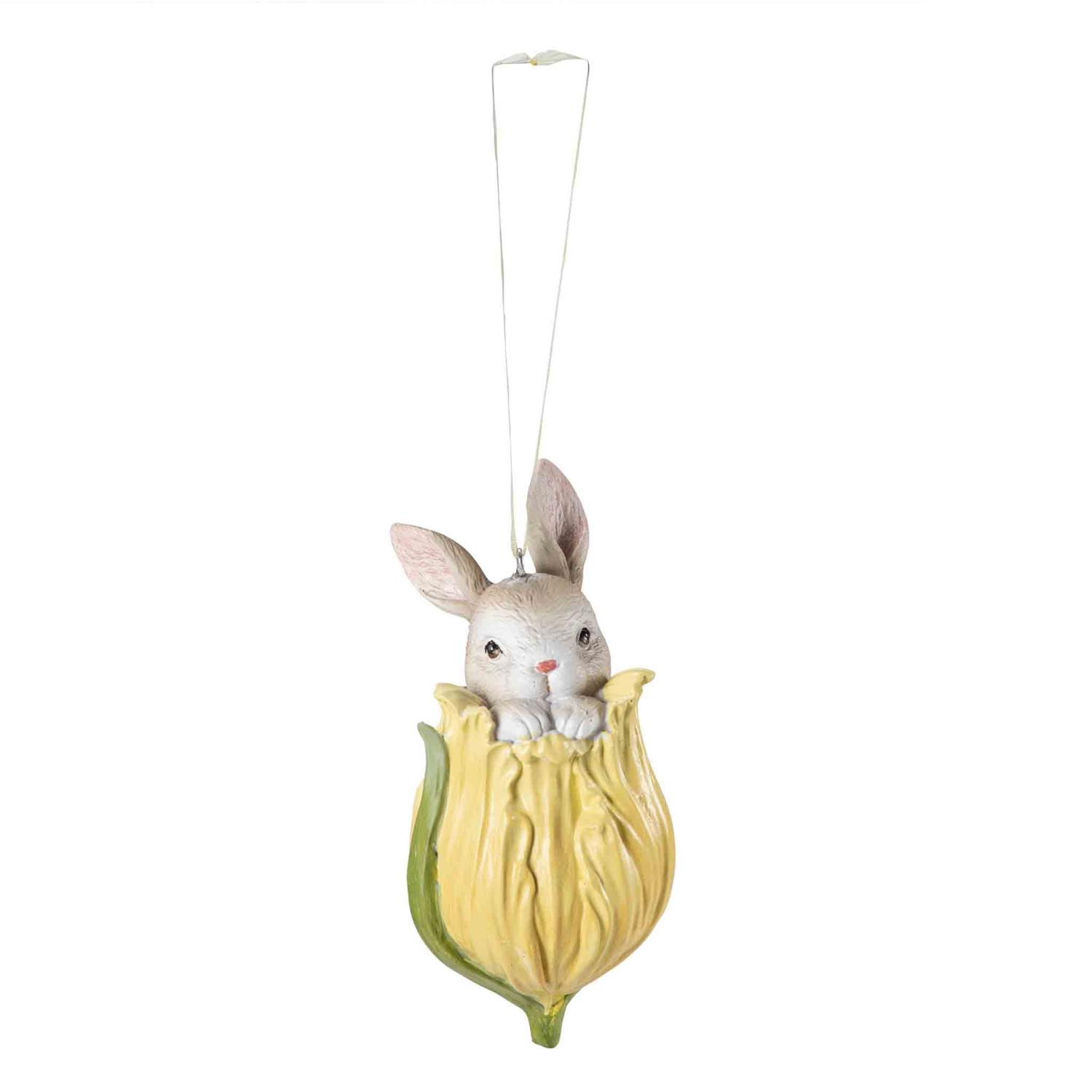 En liten kanin har funnet seg til rette i en gul tulipan og ser ut som den har funnet sitt perfekte skjulested. Denne søte dekorfiguren henger fra et bånd, så den kan enkelt plasseres på grener eller gåsunger, eller som en morsom detalj på et bord.