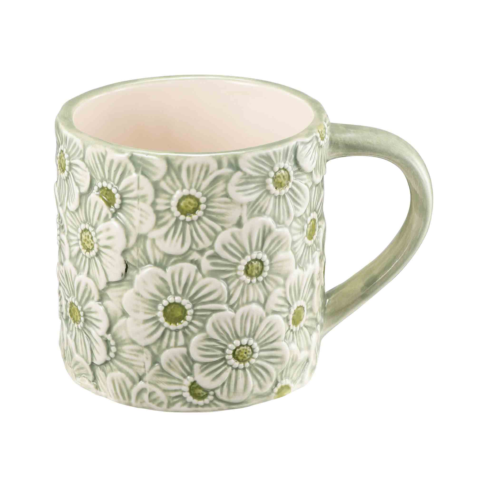 Et krus i keramikk med et vakkert blomstermønster i grønne toner. Den detaljerte overflaten gir kruset en fin struktur, mens den rolige fargepaletten gjør det enkelt å bruke både til hverdags og når du vil dekke litt ekstra pent.