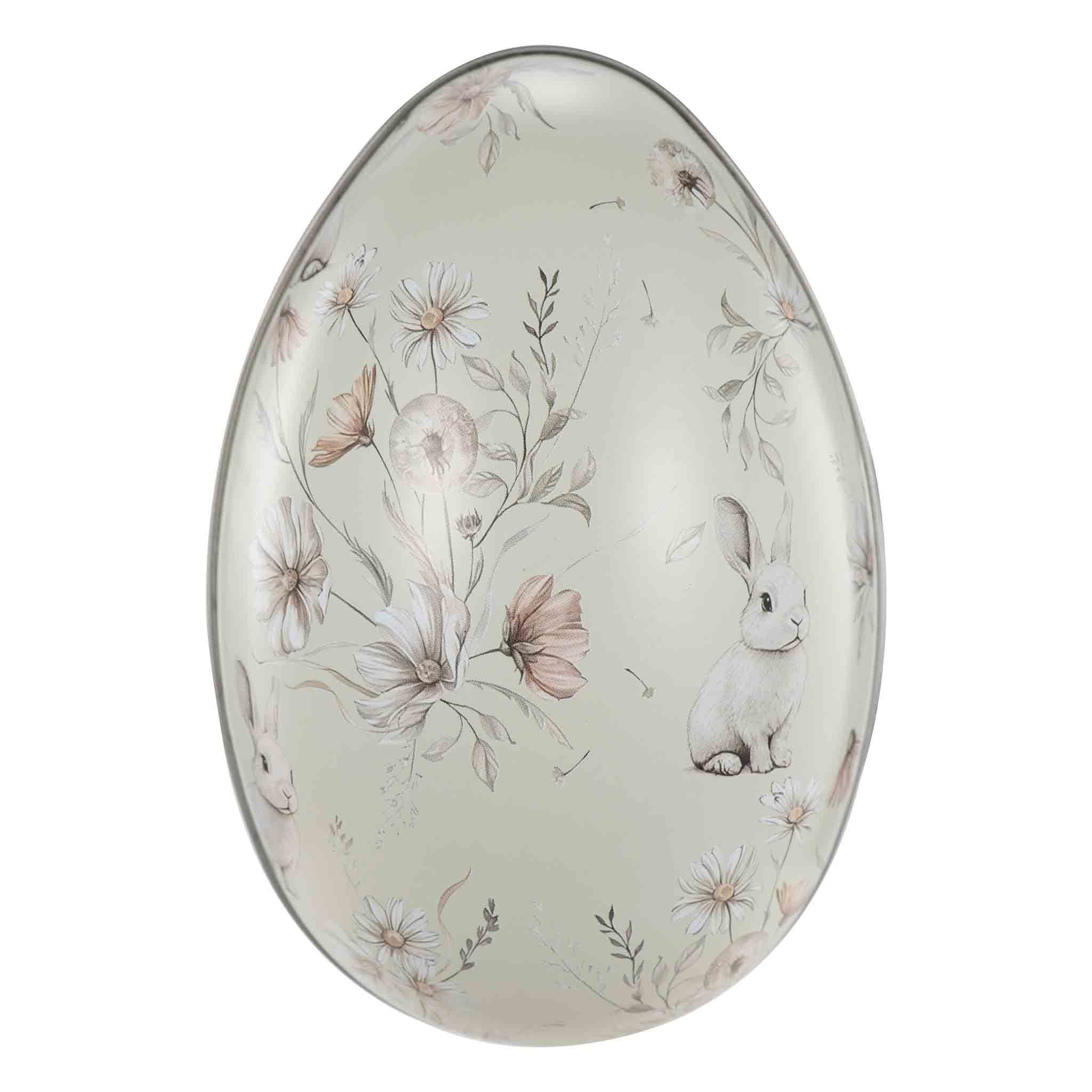 Et dekorativt påskeegg i metall med vakkert blomster og kaninprint som gir et sjarmerende og vårlig uttrykk.