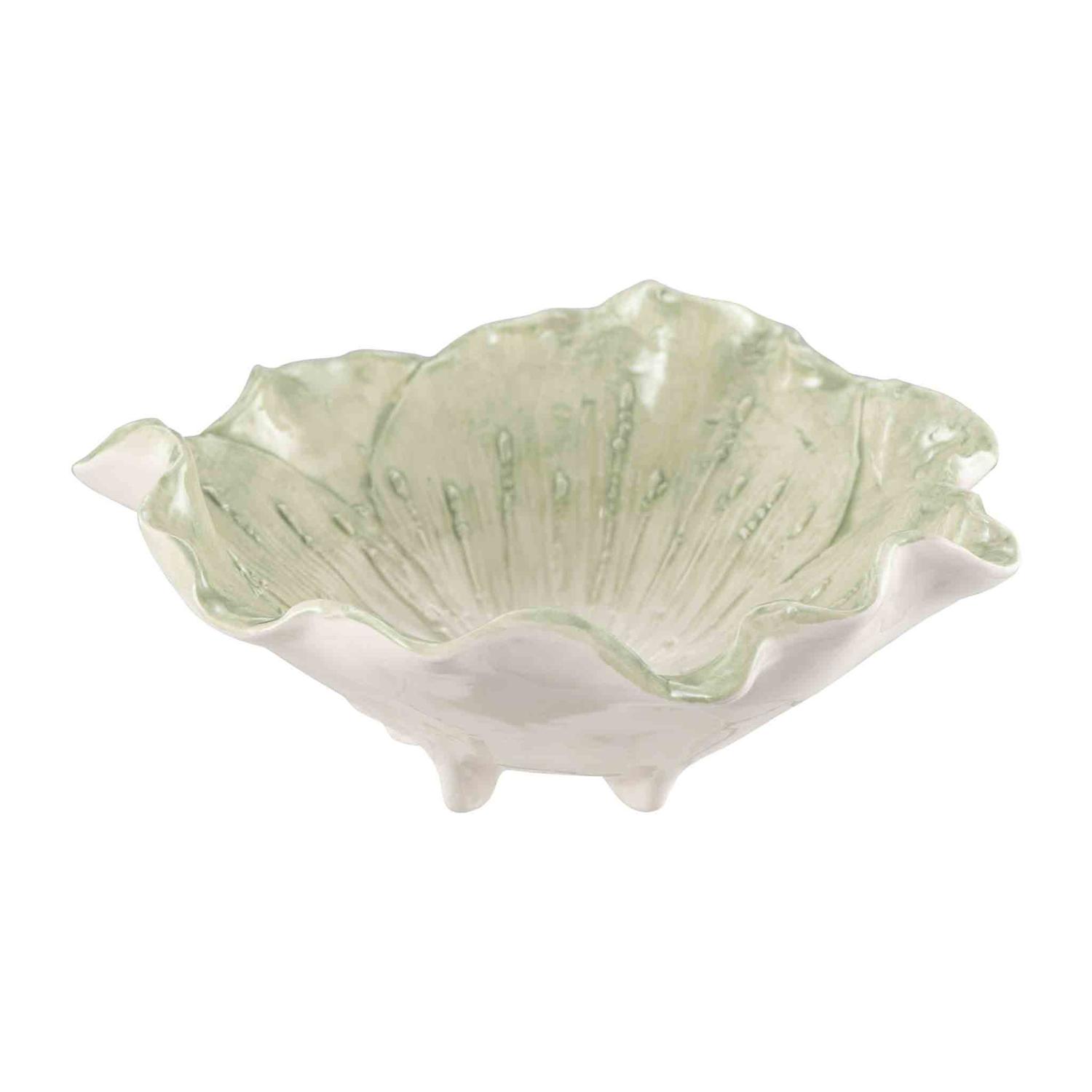 En dekorativ skål i keramikk formet som en blomst, med myke grønne og hvite toner og en bølget kant som gir et lett og vårlig uttrykk. Den detaljerte overflaten gir skålen et håndlaget preg som gjør den fin både som servering og pynt.