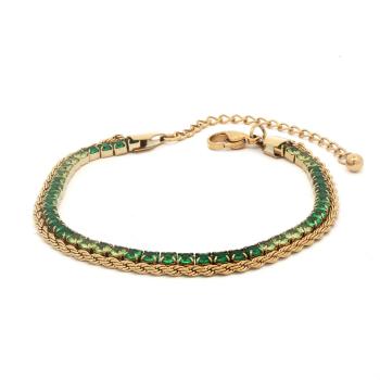 Et elegant armbånd i gullfarget metall med grønne stener som gir et friskt og glitrende uttrykk. Den flettede detaljen langs kanten gir armbåndet en spennende tekstur. Perfekt både alene og sammen med andre smykker.