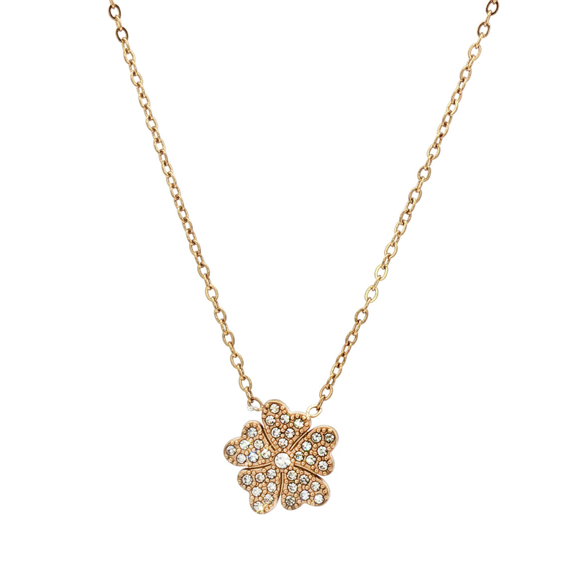 Lucky-charm…. Denne nydelige firkløveren med ett hav av krystaller er ett smykke du ikke kommer til å ta av deg. Og det trenger du ikke heller fordi denne er laget i gullbelagt stål og tåler vann, trening og parfyme.
