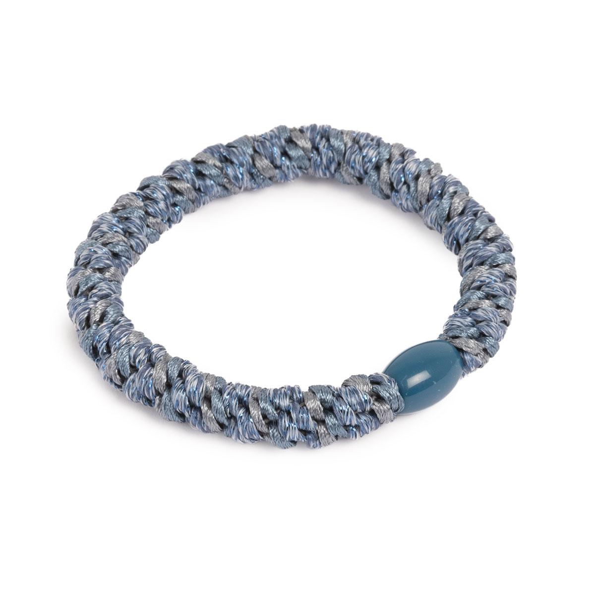 Hårstrikk med glitter i jeansblå, designet for å beskytte håret samtidig som den gir et glitrende preg.