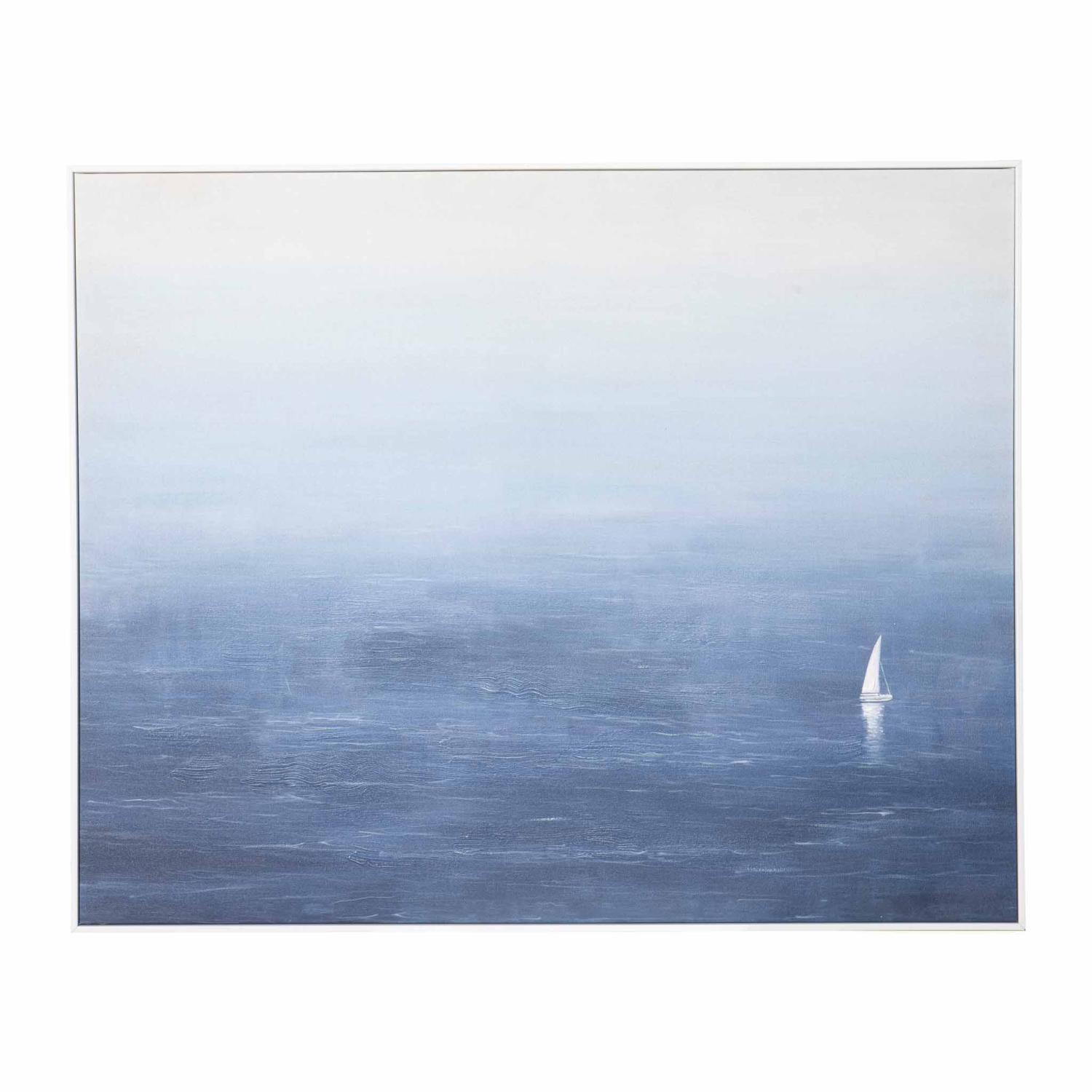 Stemningsfullt bilde med motiv av hav i rolige blåtoner og en enslig seilbåt i det fjerne. De myke overgangene mellom himmel og hav skaper en følelse av ro. Det minimalistiske uttrykket gjør bildet lett å plassere i både stue, soverom eller hytte. Heng det alene eller kombiner det med andre malerier og skap en fin bildevegg.