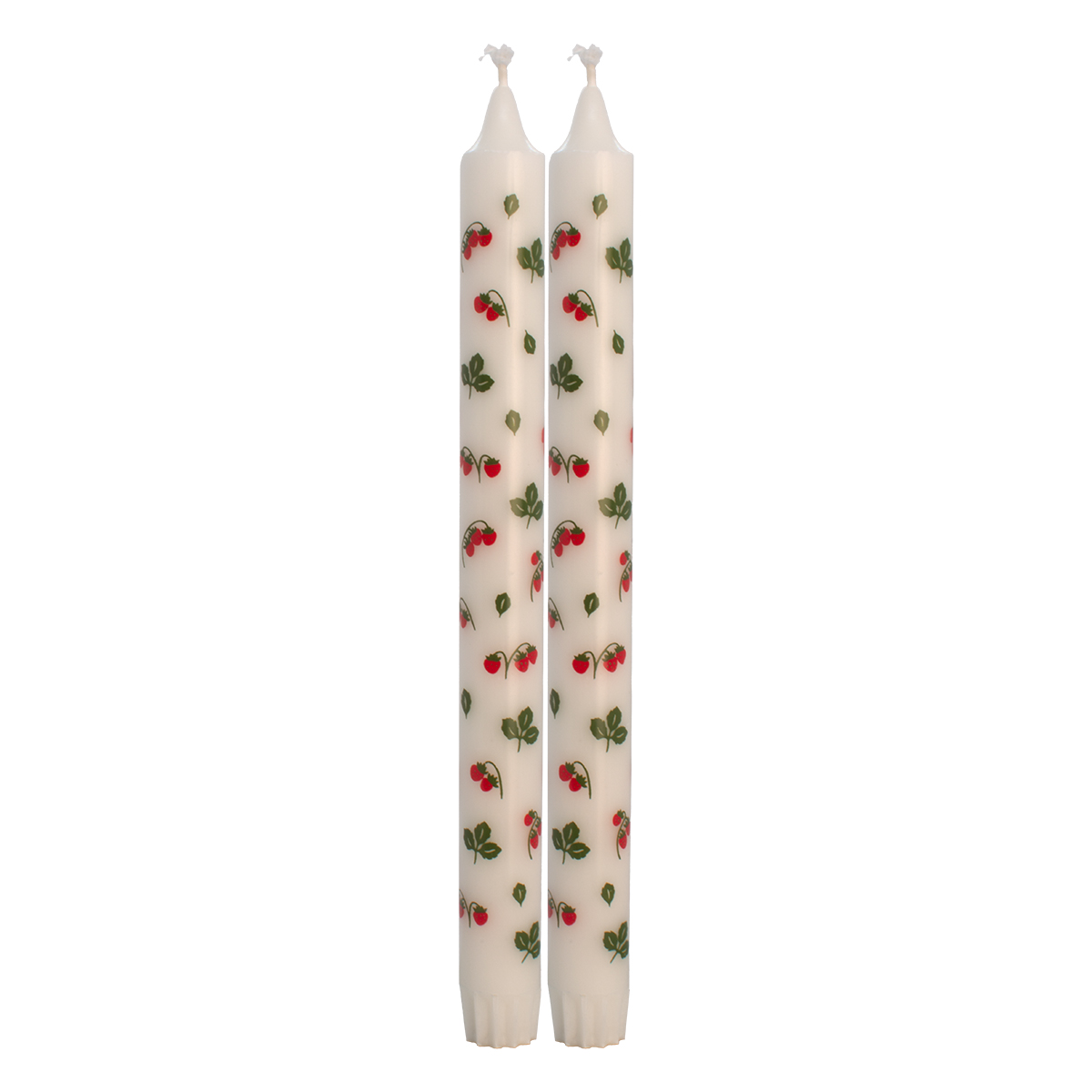 Sett med to kronelys dekorert med sjarmerende jordbærmotiv. En frisk og sommerlig detalj som gir bordet et lekent og personlig uttrykk.