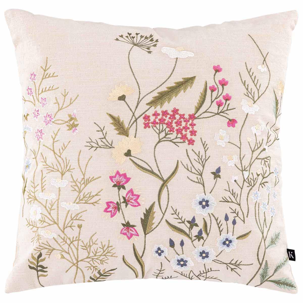 Dette putetrekket med sitt florale broderi bringer inn en naturlig og lett følelse til hjemmet. Den delikate fargepaletten og de håndbroderte blomstene tilfører et rolig uttrykk som kan lyse opp både stuen og soverommet.