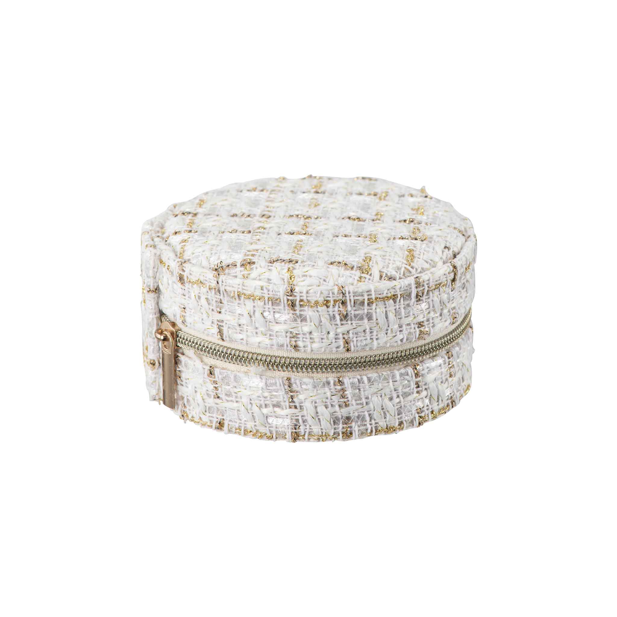 Elegant smykkeskrin i rund form trukket i vevd tekstil med delikate gulltråder. Innsiden er mykt fôret og har smarte rom for organisering av ringer, øredobber og andre små smykker. Et smykkeskrin er også en fin gaveidé til noen du er glad i.