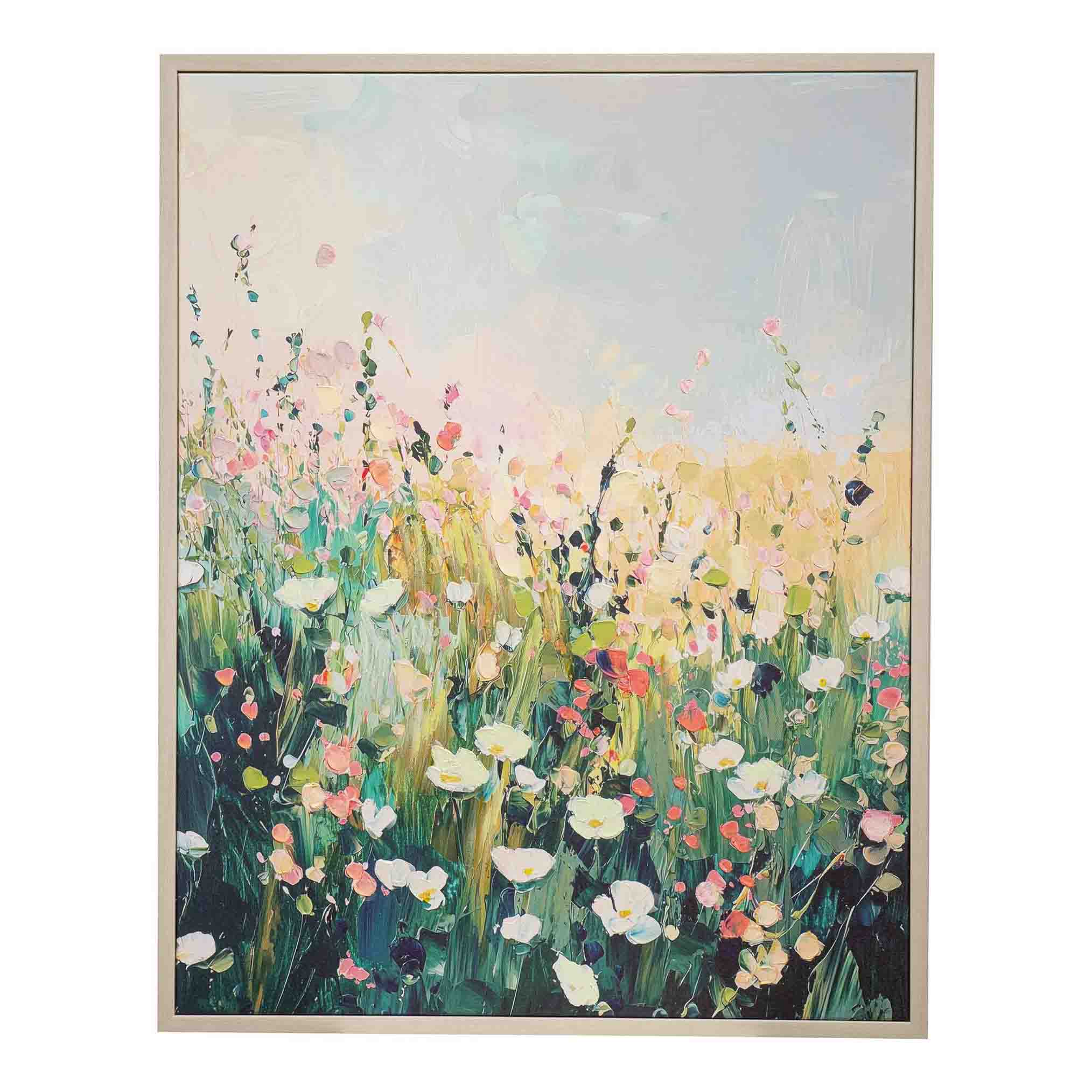 Et fargerikt og livlig maleri som henter inn følelsen av en blomstrende sommereng. De myke pastelltonene møter friske grønne detaljer og skaper et energisk uttrykk som gir rommet et løft. Maleriet har struktur i overflaten og en lys ramme som rammer inn motivet på en elegant måte.