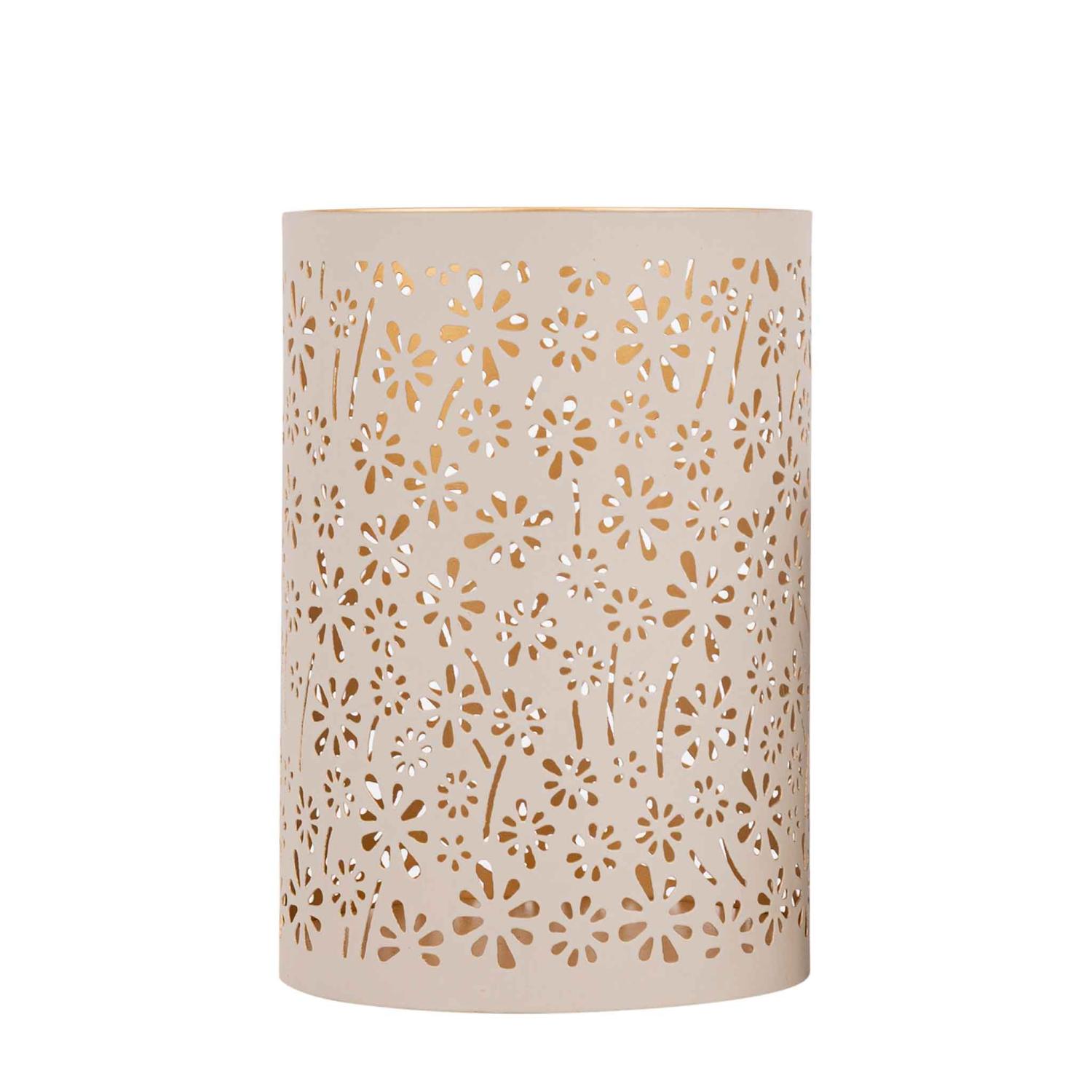 Denne lykten i lakkert metall har et fint, utskåret blomstermønster som slipper lyset mykt gjennom. Den lyse utsiden kombineres med en gyllen innside som gir et varmt og stemningsfullt uttrykk når lyset tennes.