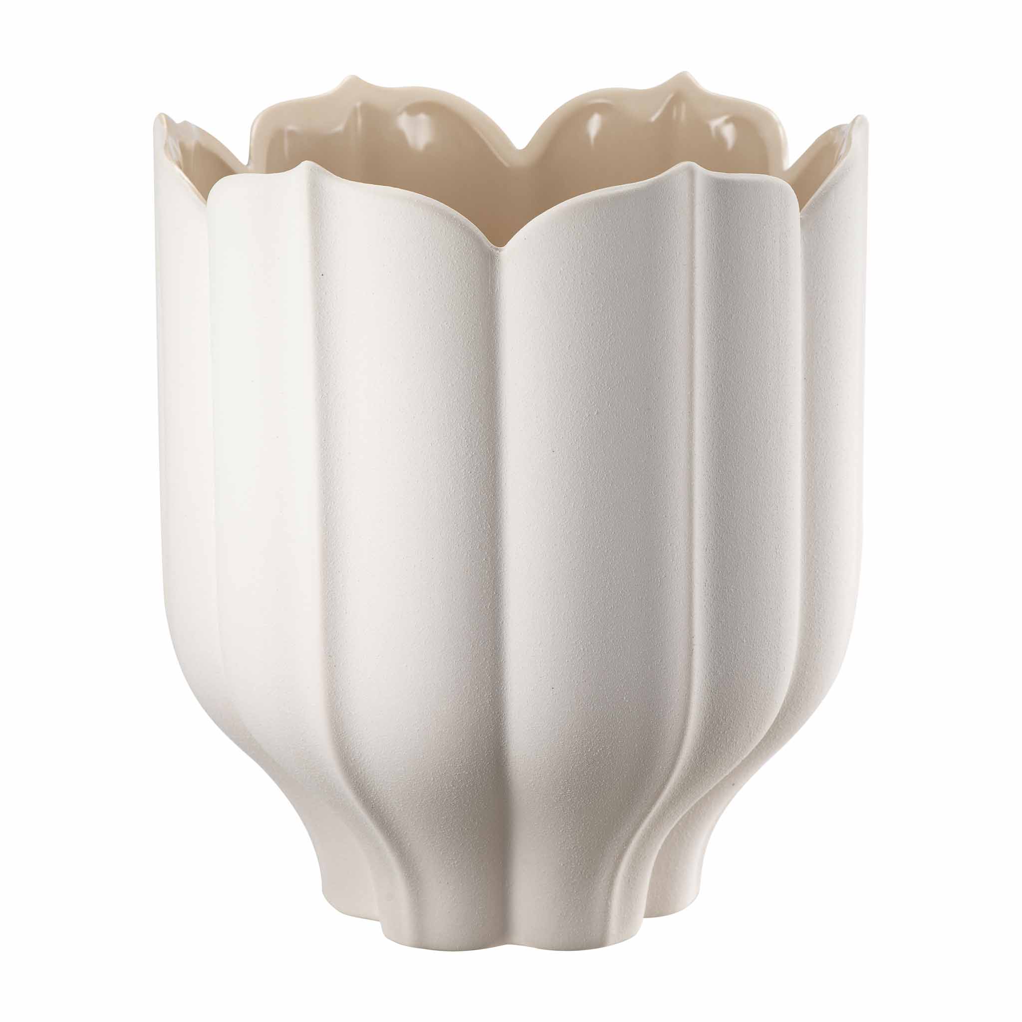 En stilren blomsterpotte i myk kremfarge med bølgende kanter som gir formen et elegant løft. Den passer nydelig til grønne planter som eføy, pothos eller en frodig plante med hengende blader. Sett den på en kommode, i vinduskarmen eller som et rolig blikkfang på spisebordet.