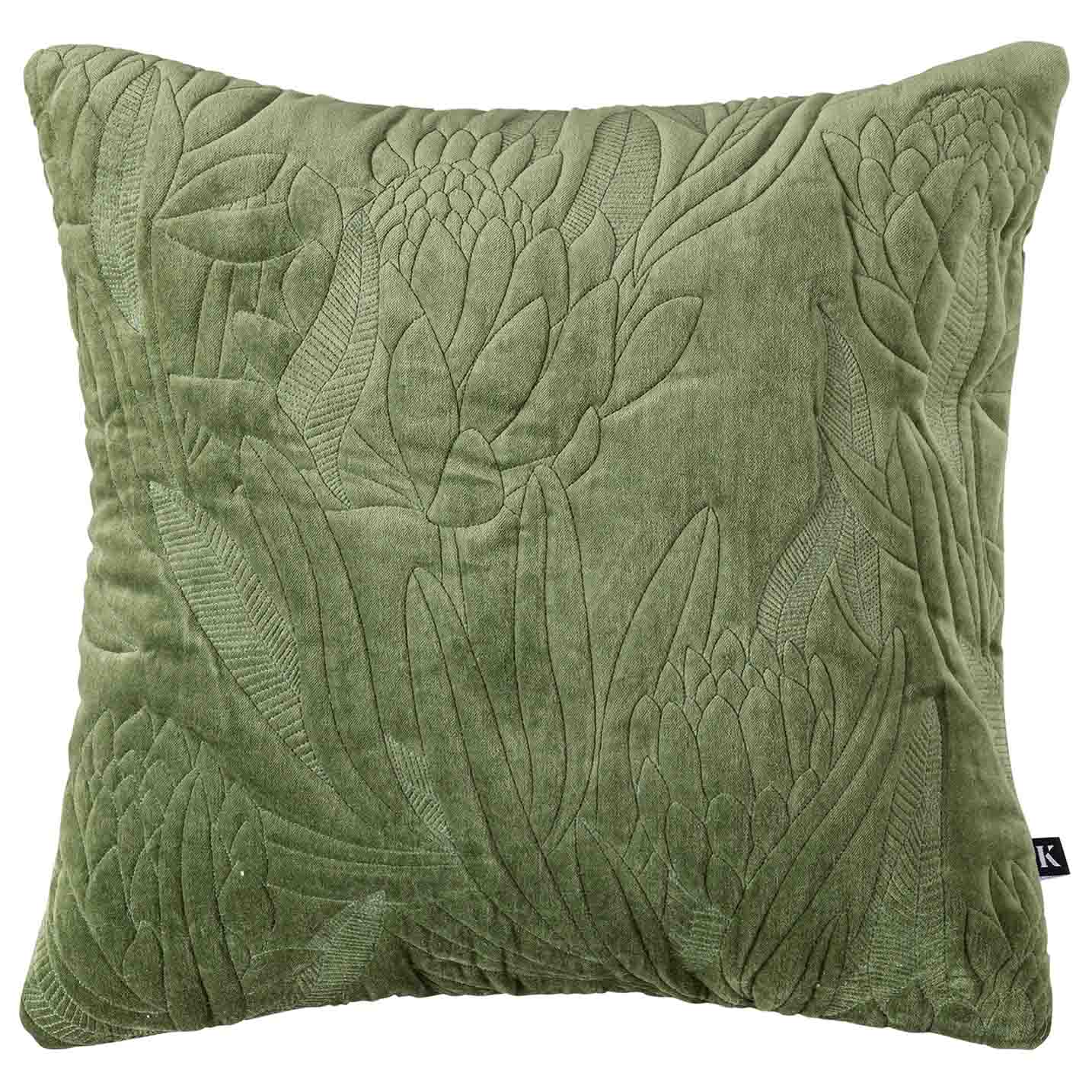 Putetrekket har et subtilt artisjokkmotiv som gir en moderne vri i sofaen. Det kan stå frem som et blikkfang sammen med dusere farger. Eller brukes som en fin støttepute til puter med broderier eller mønster. Den myke teksturen gir ekstra liv til sofakroken uten at helheten føles for stram.