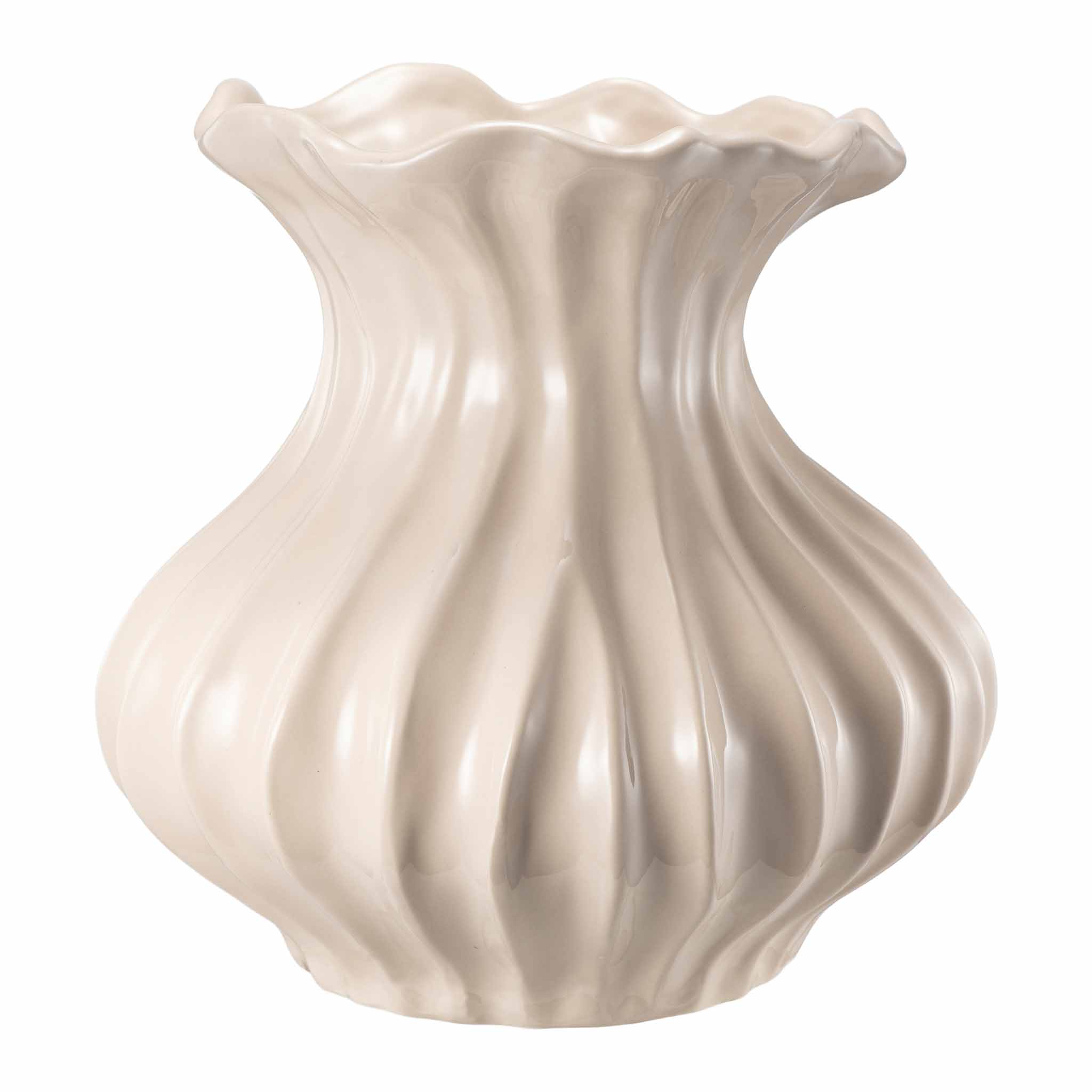 Vasen har en myk, bølgende form med glassert overflate som gir et elegant uttrykk i rommet. Den passer fint på konsollbord, i vinduskarmen eller som et blikkfang på spisebordet. Kombiner gjerne med evigvarende blomster, en fin lyslykt eller elegante dekorfigurer.